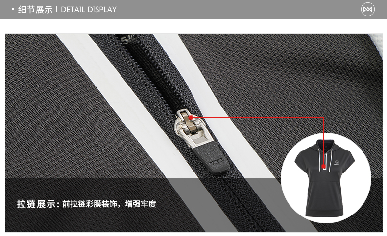 修身版型,连帽拉链半开襟设计,前拉链还有彩膜装饰,增强牢度。左胸处局部有印花,弧形袖口设计,双线缝合,车线工整。
