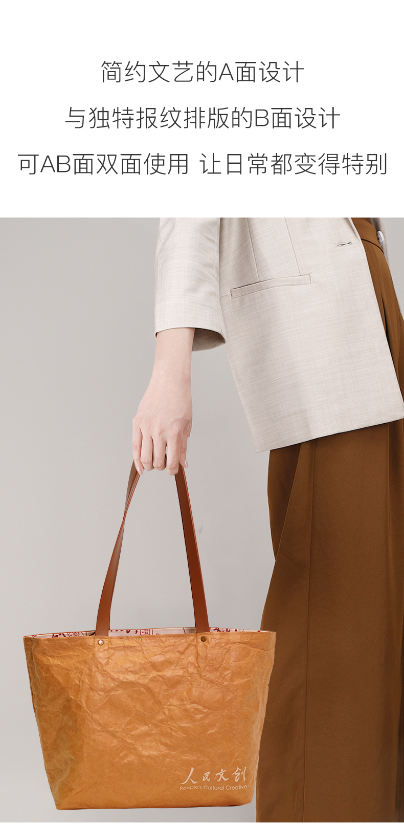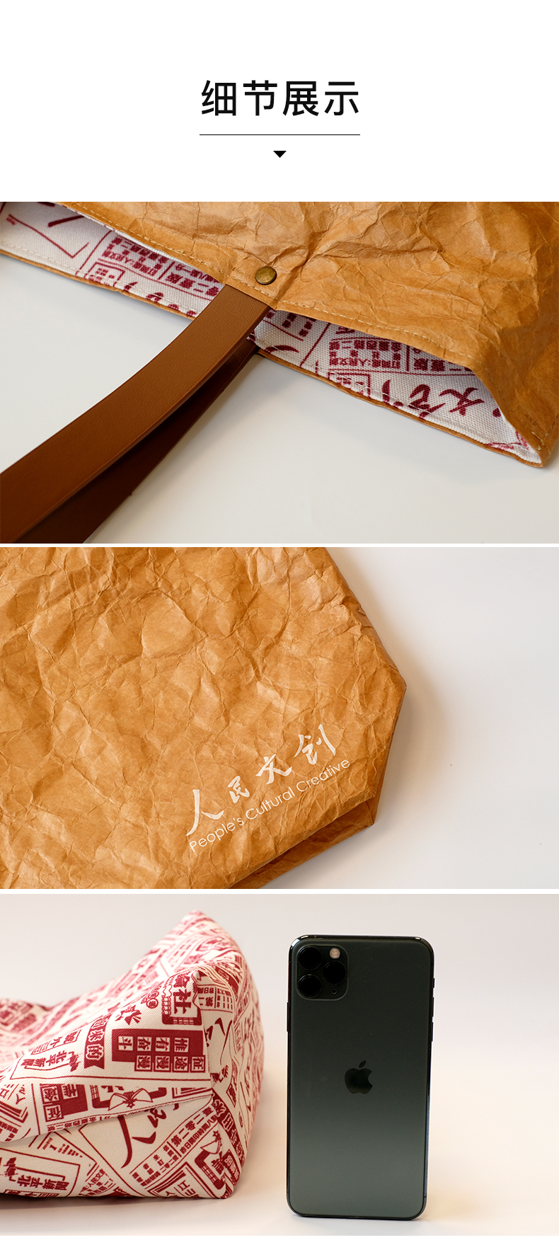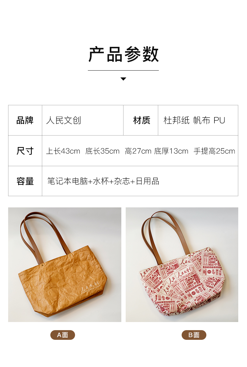 这款人民文创的杜邦纸帆布包,简约时尚的设计,外层采用杜邦纸面料,防水耐磨易清洗,触感柔软,质感厚实,表面纸一般的天然褶皱感,长期使用会形成专属的痕迹,质感十足,内层帆布,独特的报纹排版的B面,双面可用,使用方便。