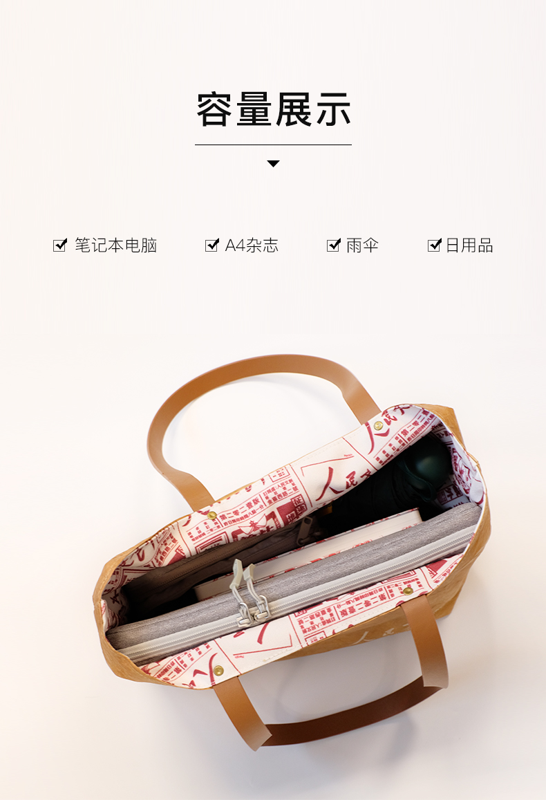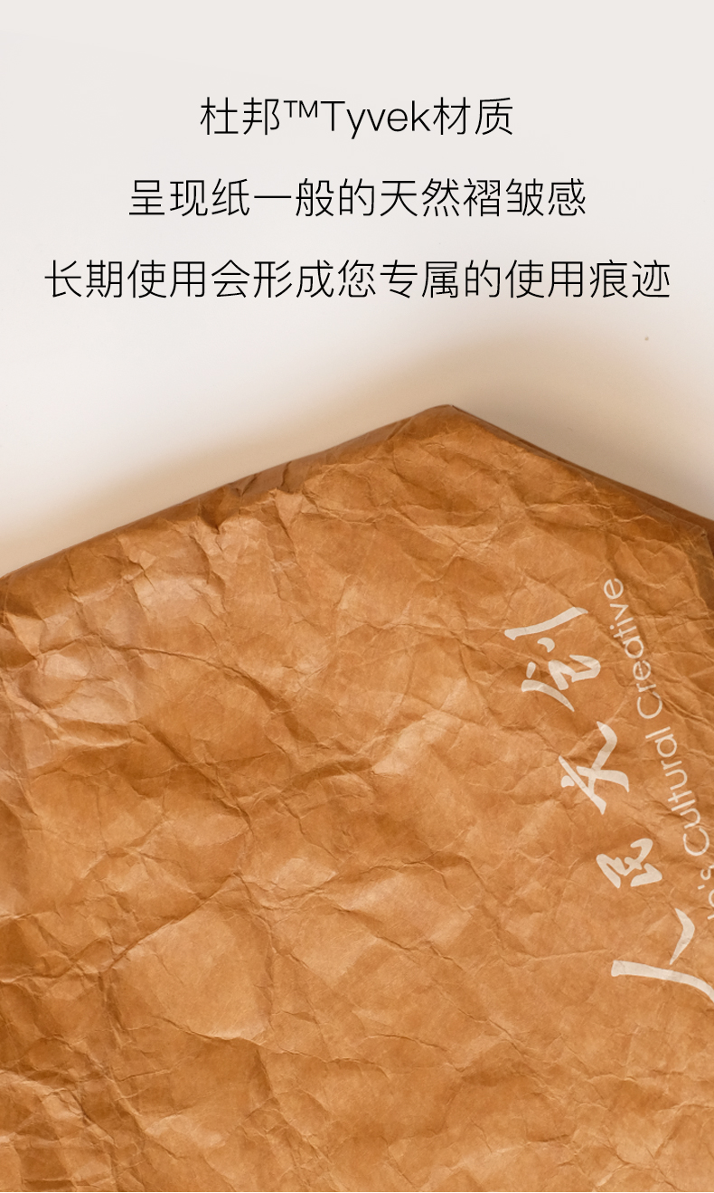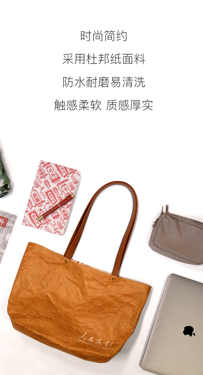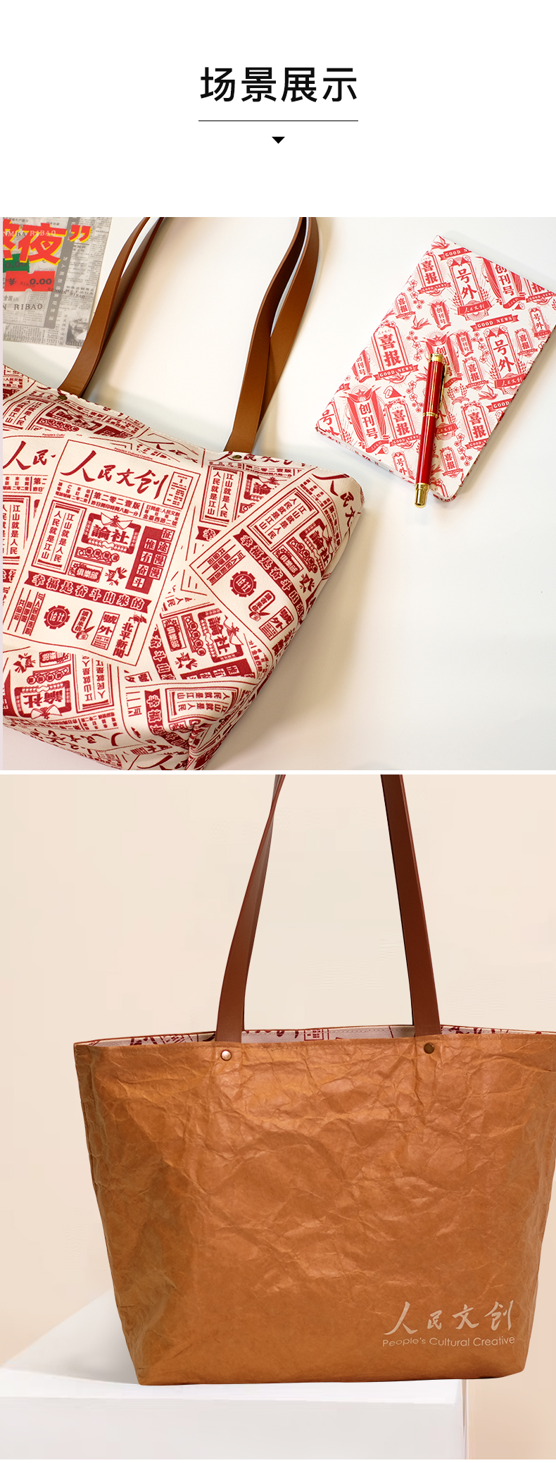 这款人民文创的杜邦纸帆布包,简约时尚的设计,外层采用杜邦纸面料,防水耐磨易清洗,触感柔软,质感厚实,表面纸一般的天然褶皱感,长期使用会形成专属的痕迹,质感十足,内层帆布,独特的报纹排版的B面,双面可用,使用方便。