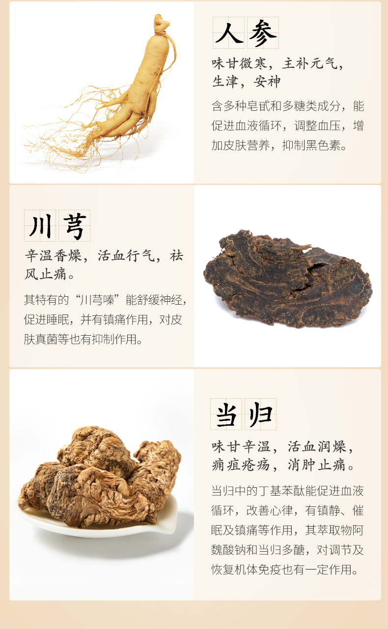 川芎:辛温香燥,活血行气,祛风止痛。其特有的“川芎嗪”能舒缓神经,促进睡眠,并有镇痛作用,对皮肤真菌等也有抑制作用。