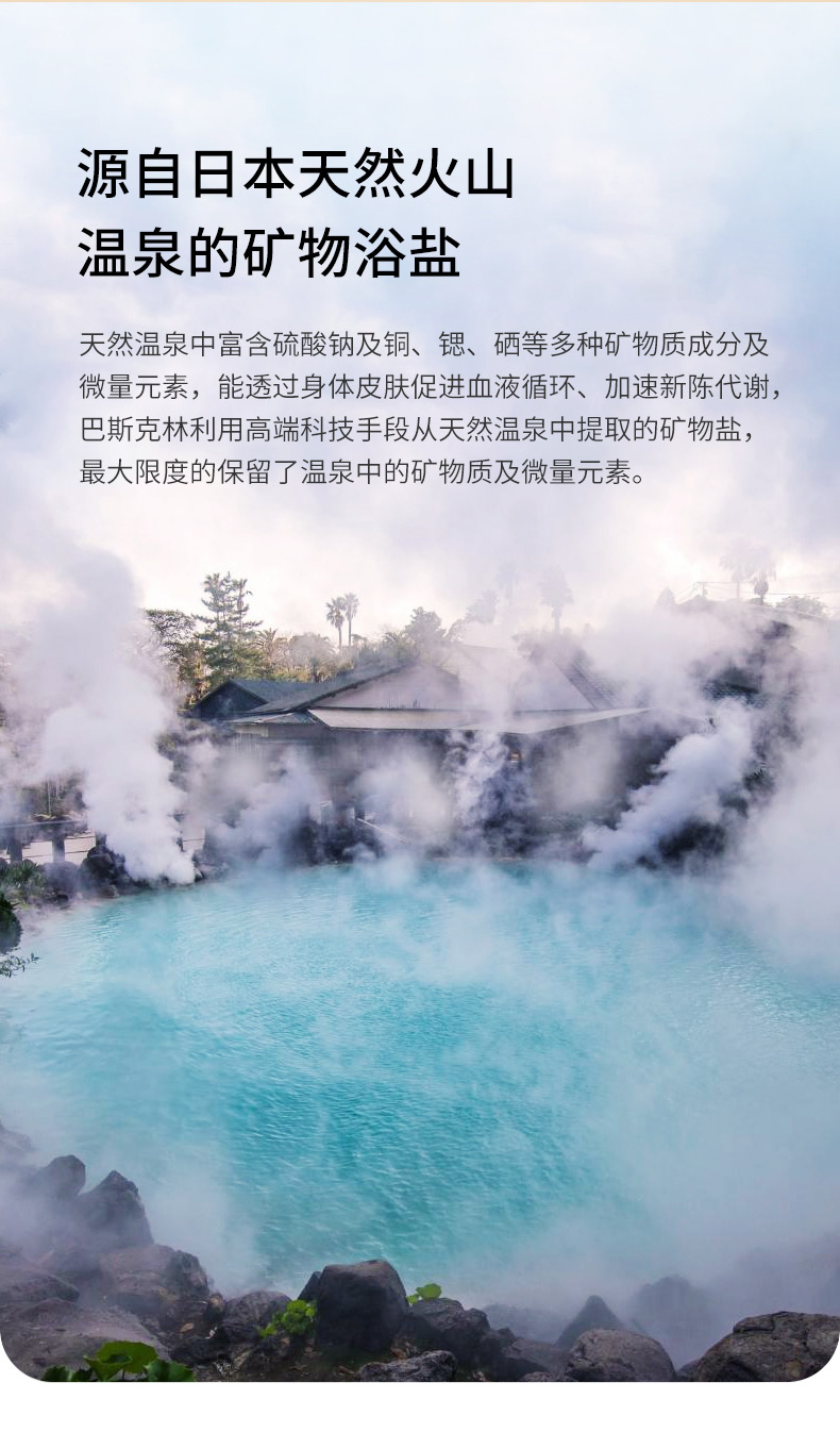 源自日本天然火山温泉的矿物浴盐。天然温泉中富含硫酸钠及铜、锶、硒等多种矿物质成分及微量元素,能透过身体皮肤促进血液循环、加速新陈代谢,巴斯克林利用高端科技手段从天然温泉中提取的矿物盐,最大限度的保留了温泉中的矿物质及微量元素。