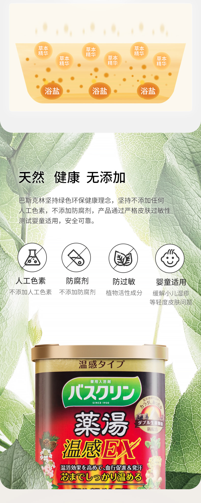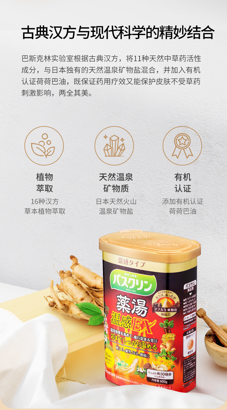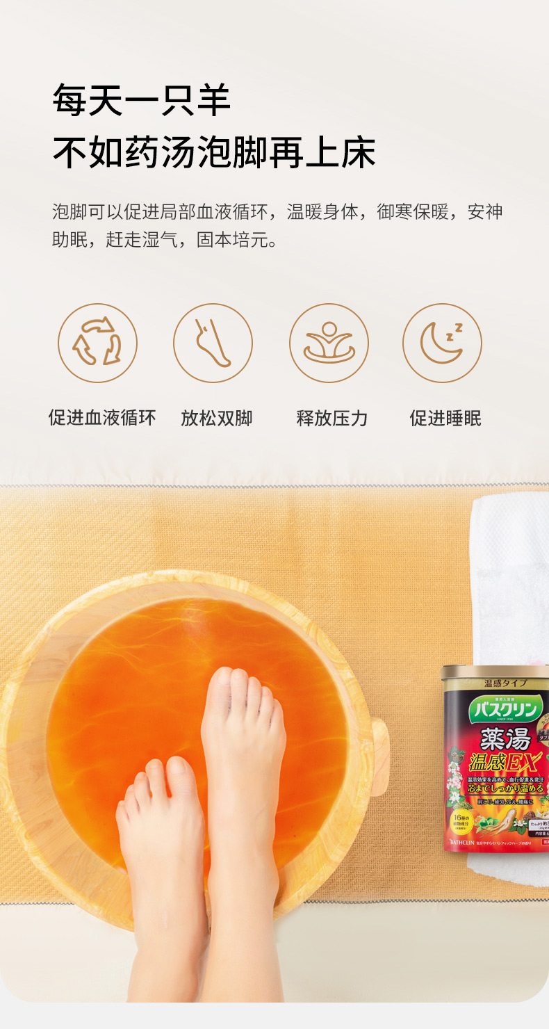 这款巴斯克林 生姜泡脚粉,日本进口,将16种天然中草药活性成分,与日本独有的天然温泉矿物盐混合,并加入有机认证荷荷巴油,既保证药用疗效又能保护皮肤不受草药刺激影响,两全其美。不添加人工色素、防腐剂、添加剂,对皮肤无刺激。