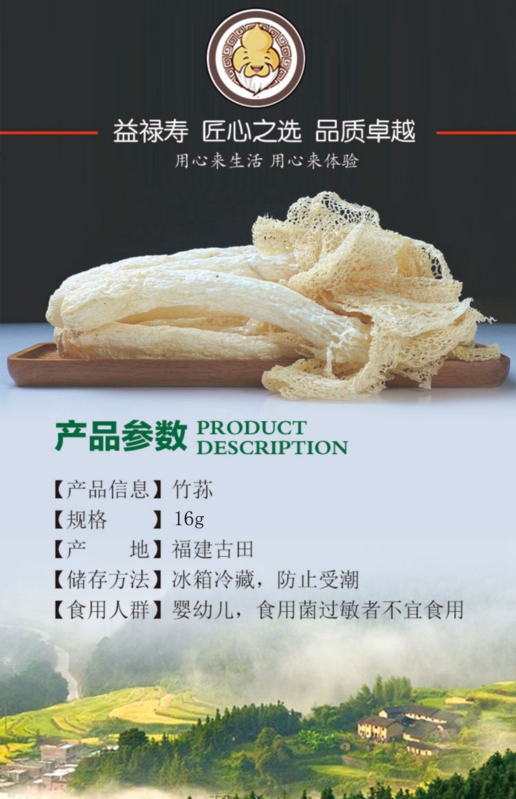 这款益禄寿无硫熏古田竹荪干货,产地是福建古田,是20年现摘新货,选用优质新鲜竹荪为原料,经4小时的慢火烘干,不用硫熏,使竹荪呈自然的淡黄色,同时完美的锁住营养精华,最后是8比1的制干比例。