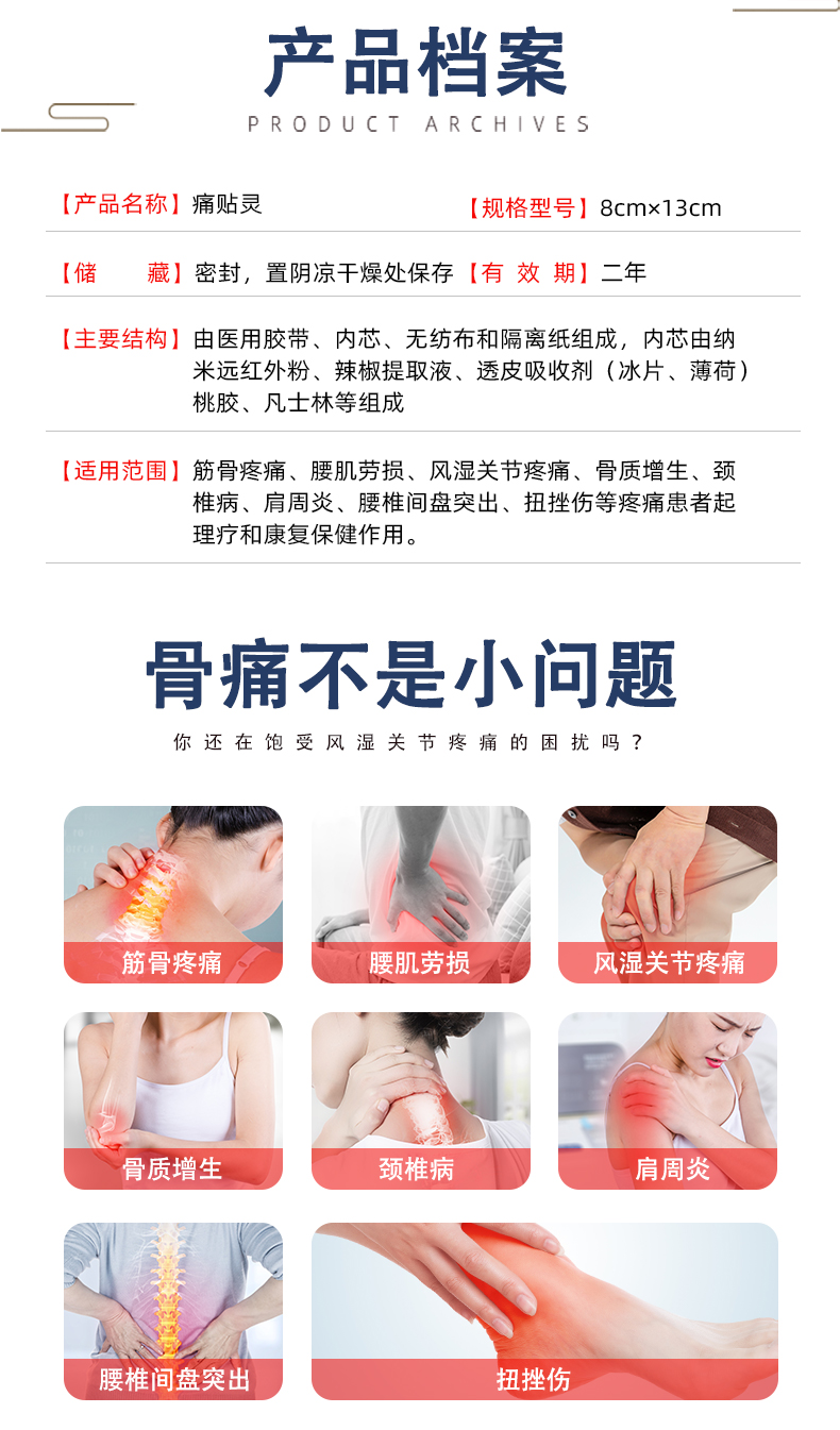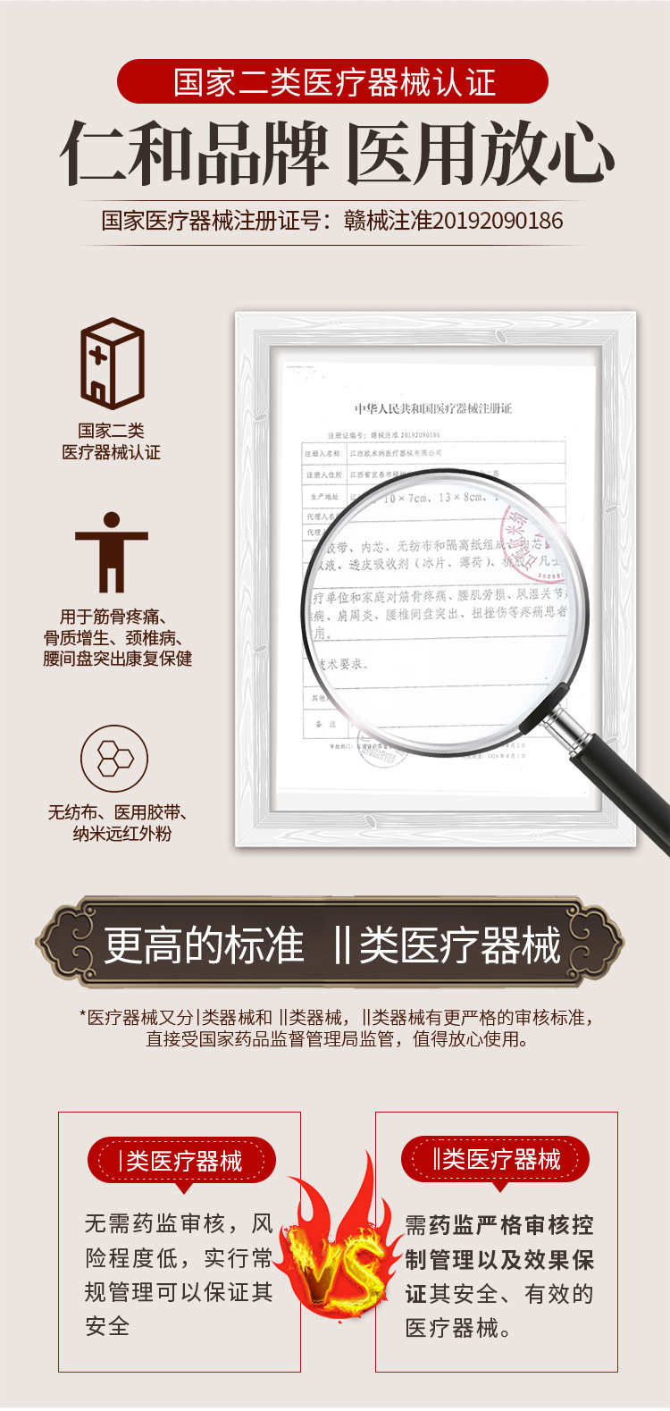 这款仁和痛贴灵,属于II类医疗器械,更严格更高标准!用于筋骨疼痛、骨质增生、颈椎病、腰间突出康复保健等,哪里疼贴哪里!