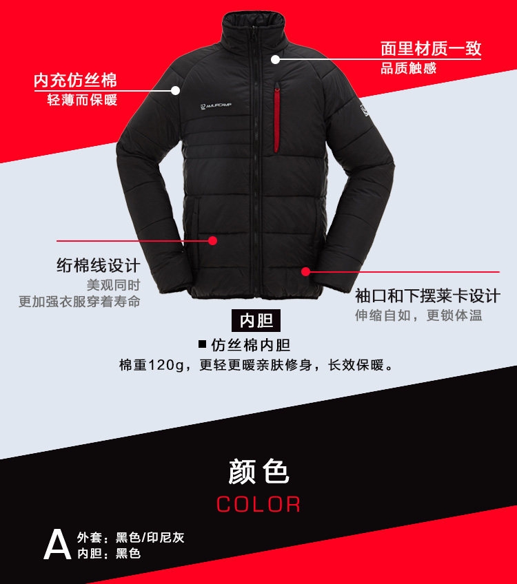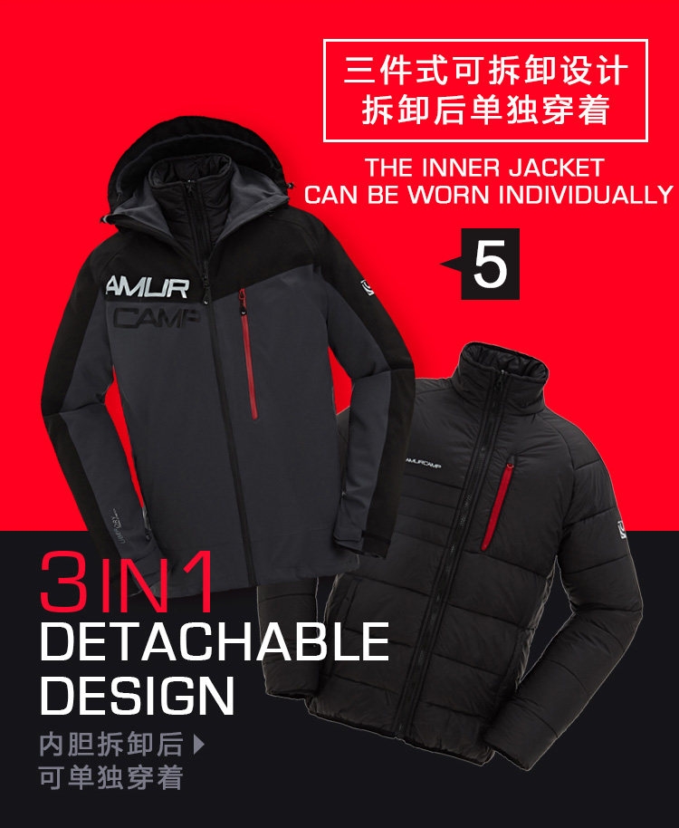 Amurcamp这款三合一棉服,外层10000mm水压、15000mm透湿的防水冲锋衣,防水拉链,接缝全压胶防水处理,防水效果优秀,超出大多数冲锋衣的5000-8000mm水压。里层是棉服内胆,填充120克仿丝棉,保暖效果优于抓绒。