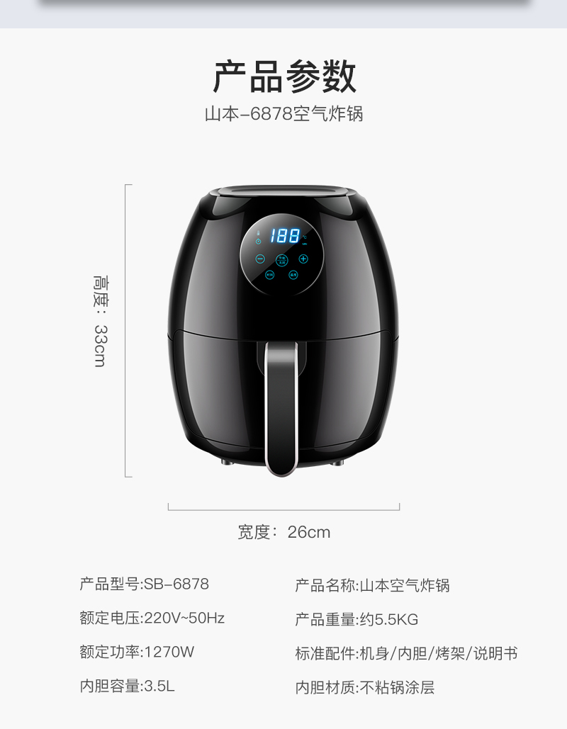 这款山本 SB-6878 空气炸锅是,3.5L大容量,使用液晶触控,操作更方便,还拥有7大智能便捷菜单。