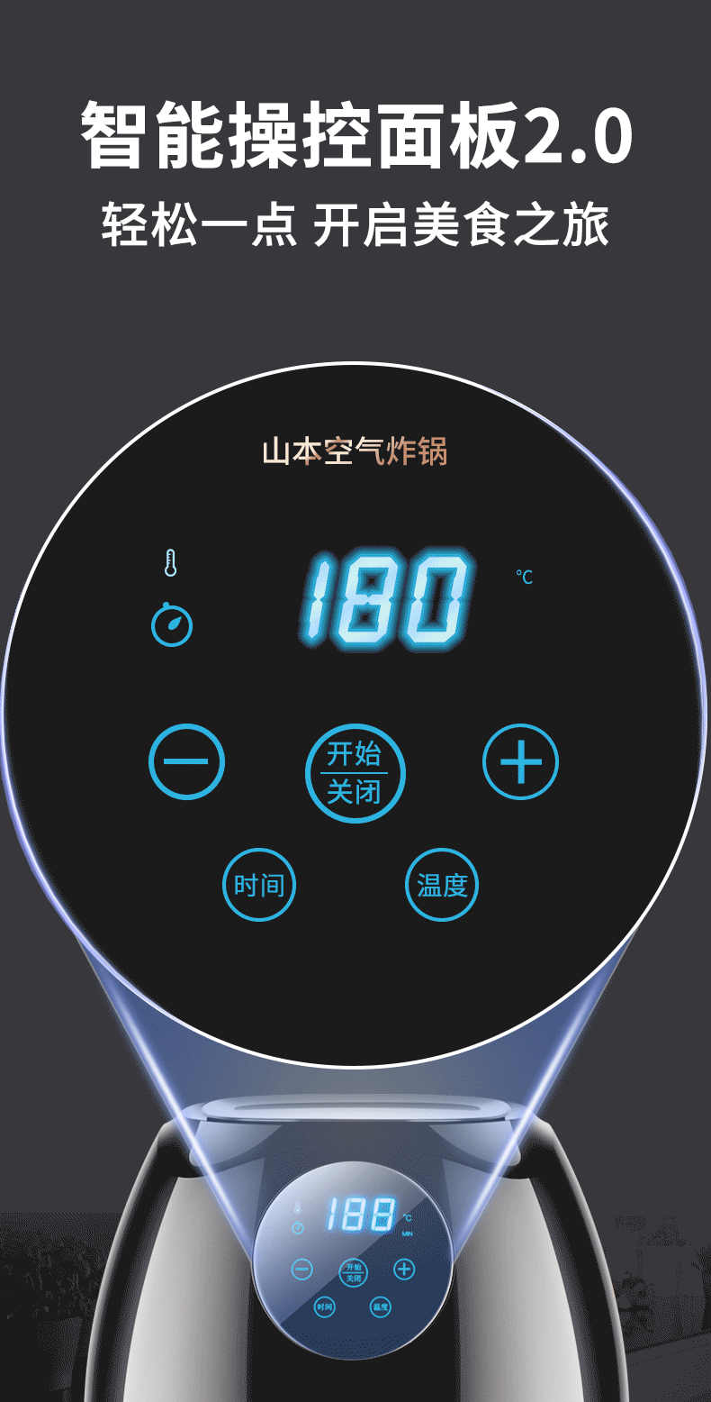 通过触摸屏进行数字化控温,可在80-200℃之间精确至每一度,控温更精准,能更好的烹饪各式食物,还有60分钟的预约定时。可一键设置定时,温度、时间都可以自动定时设置,到时自动停止工作,还能自动恒温保温。