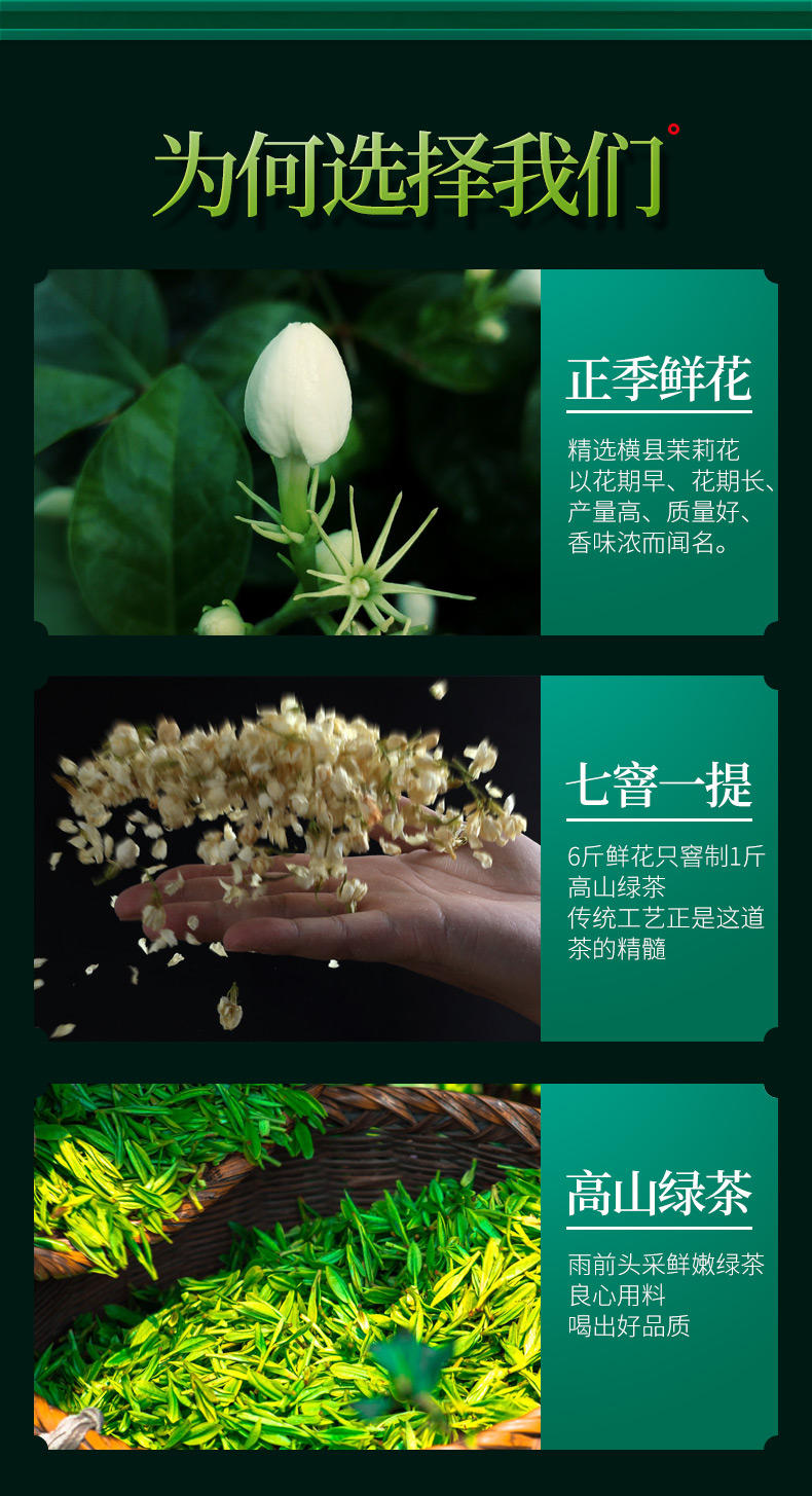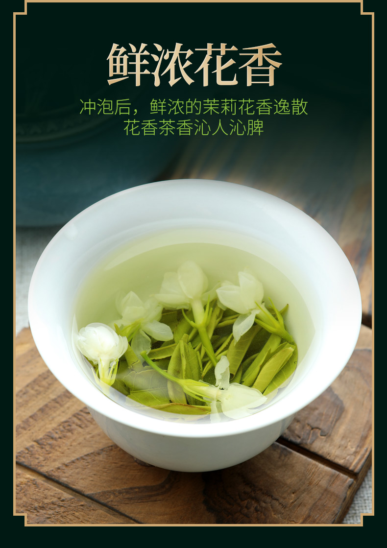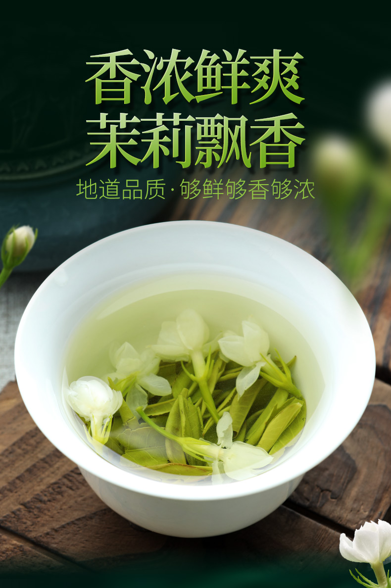 这款郡望堂号正宗茉莉花茶,特级浓香型,选用横县原产浓香茉莉和高山绿茶,茶形花形匀整优美、白毫密布。冲泡后,鲜浓的茉莉花香飘逸,花香茶香相互渗透,沁人沁脾,这是花与茶的完美邂逅,口感醇正顺滑。