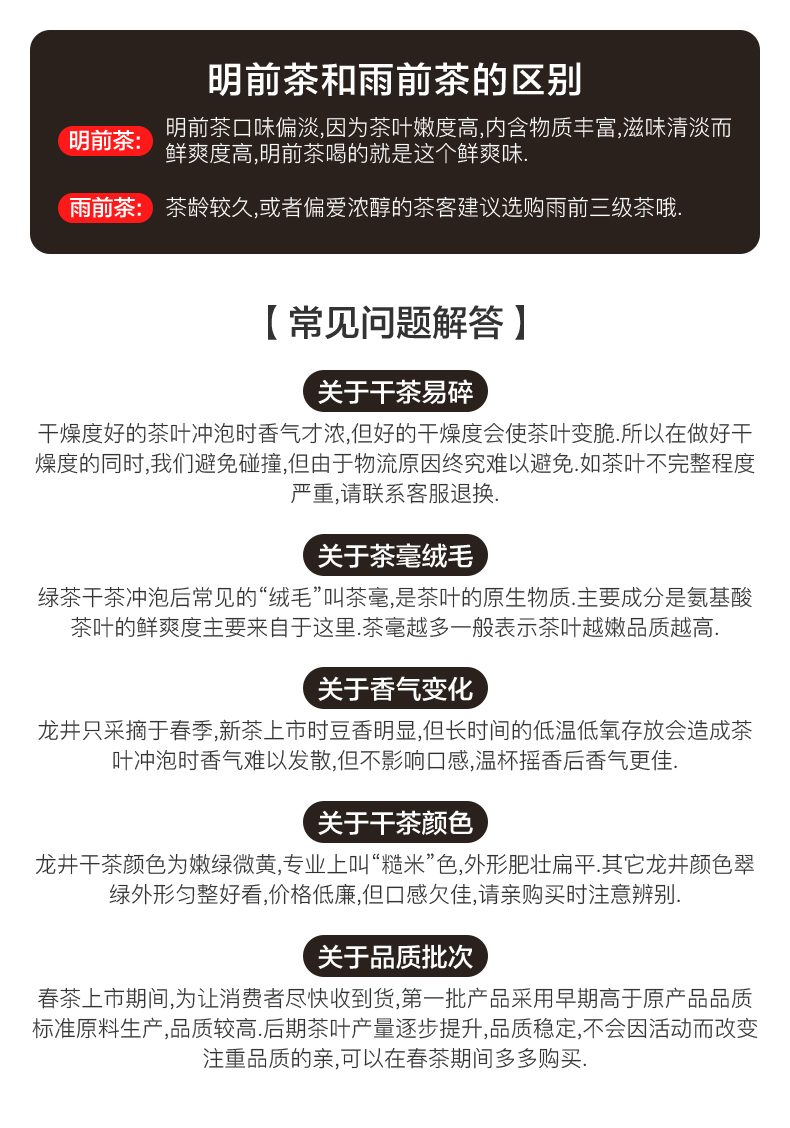 这款狮峰排西湖龙井,出自一级核心产区“龙井村”。在清明节前采制的茶叶,受虫害侵扰少,芽叶细嫩,色翠香幽,味醇形美,是茶中佳品。同时,由于清明前气温普遍较低发芽数量有限,生长速度较慢,能达到采摘标准的产量很少,所以又有“明前茶,贵如金”之说。