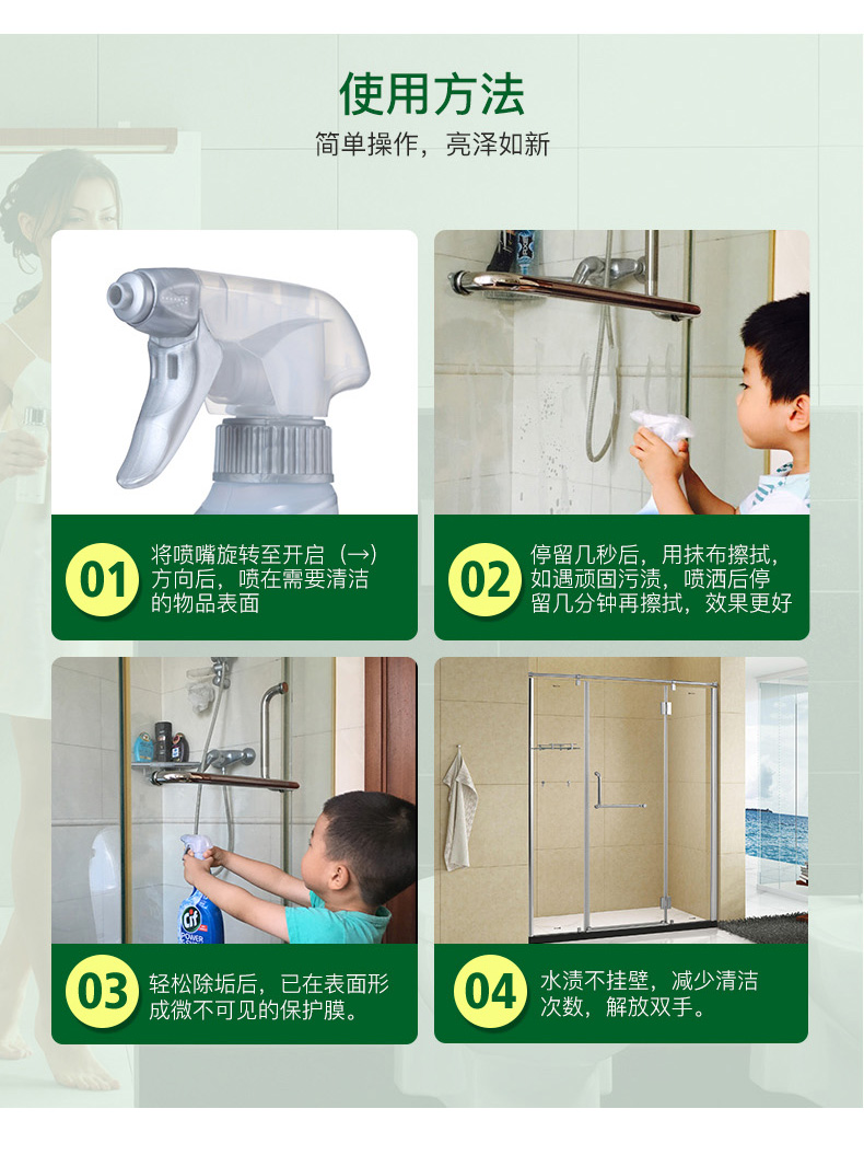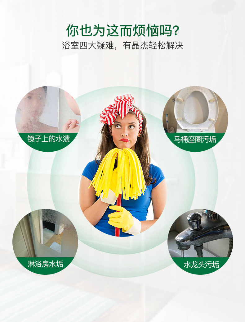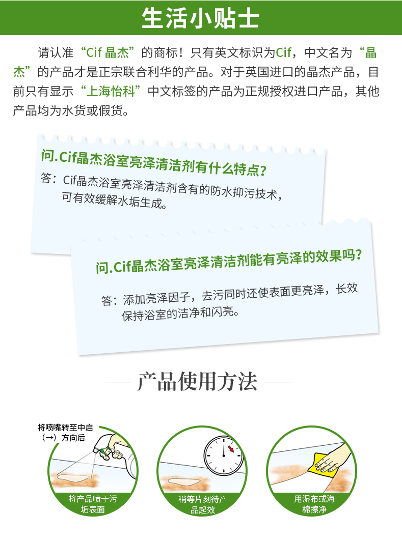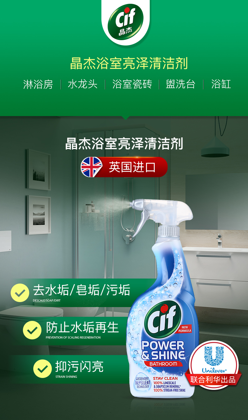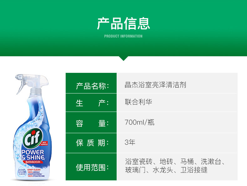 这款晶杰浴室清洁剂,英国原装进口,含有快速清洁配方,一喷一擦,快速分解水垢皂垢污渍,去除浴室尴尬臭味,保持水龙头,洗漱台,浴缸和瓷砖亮洁如新。