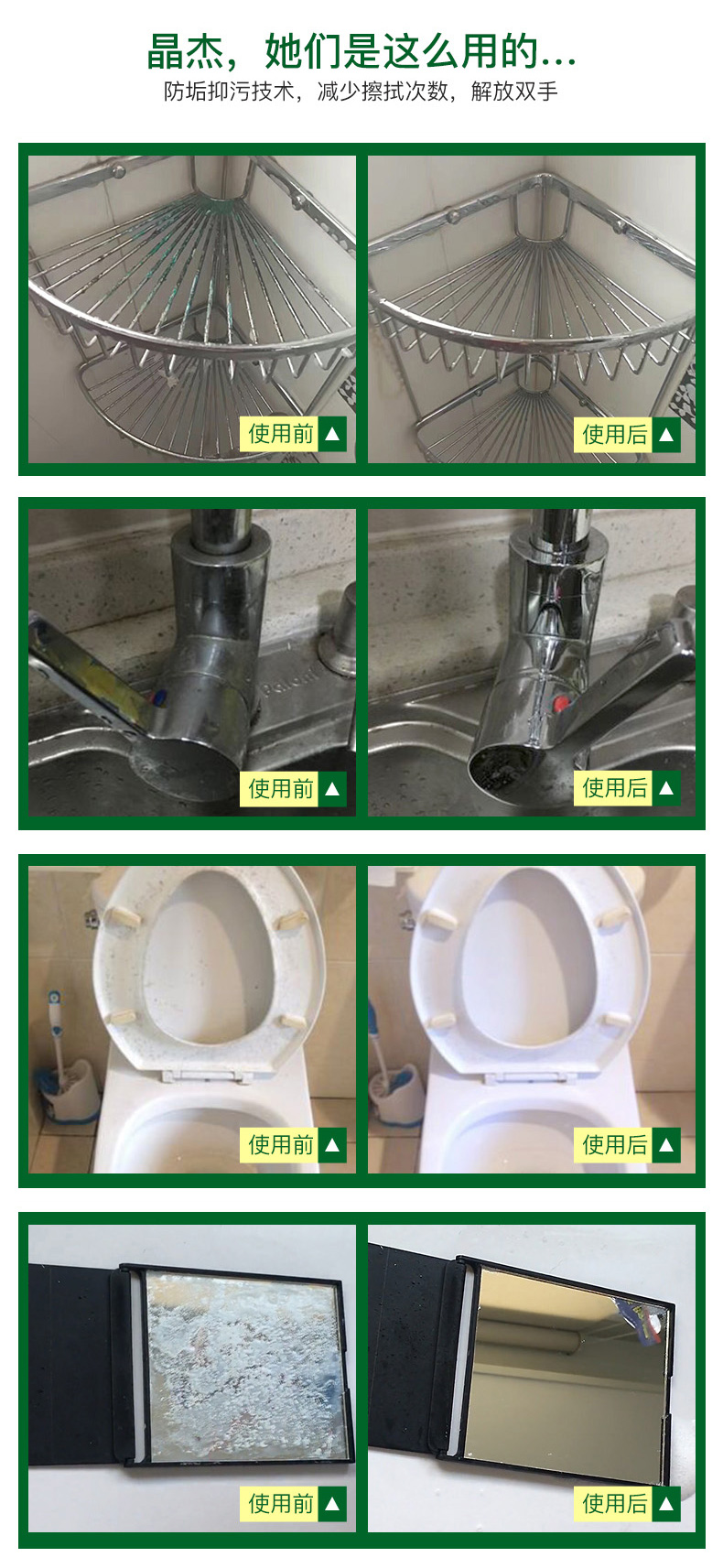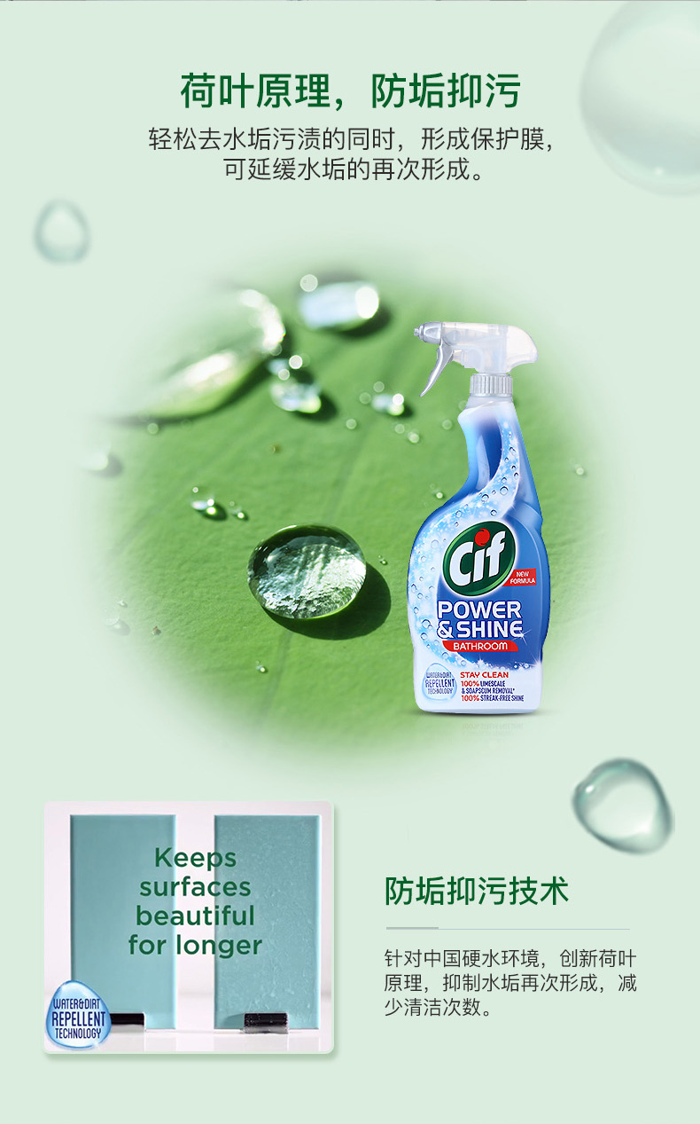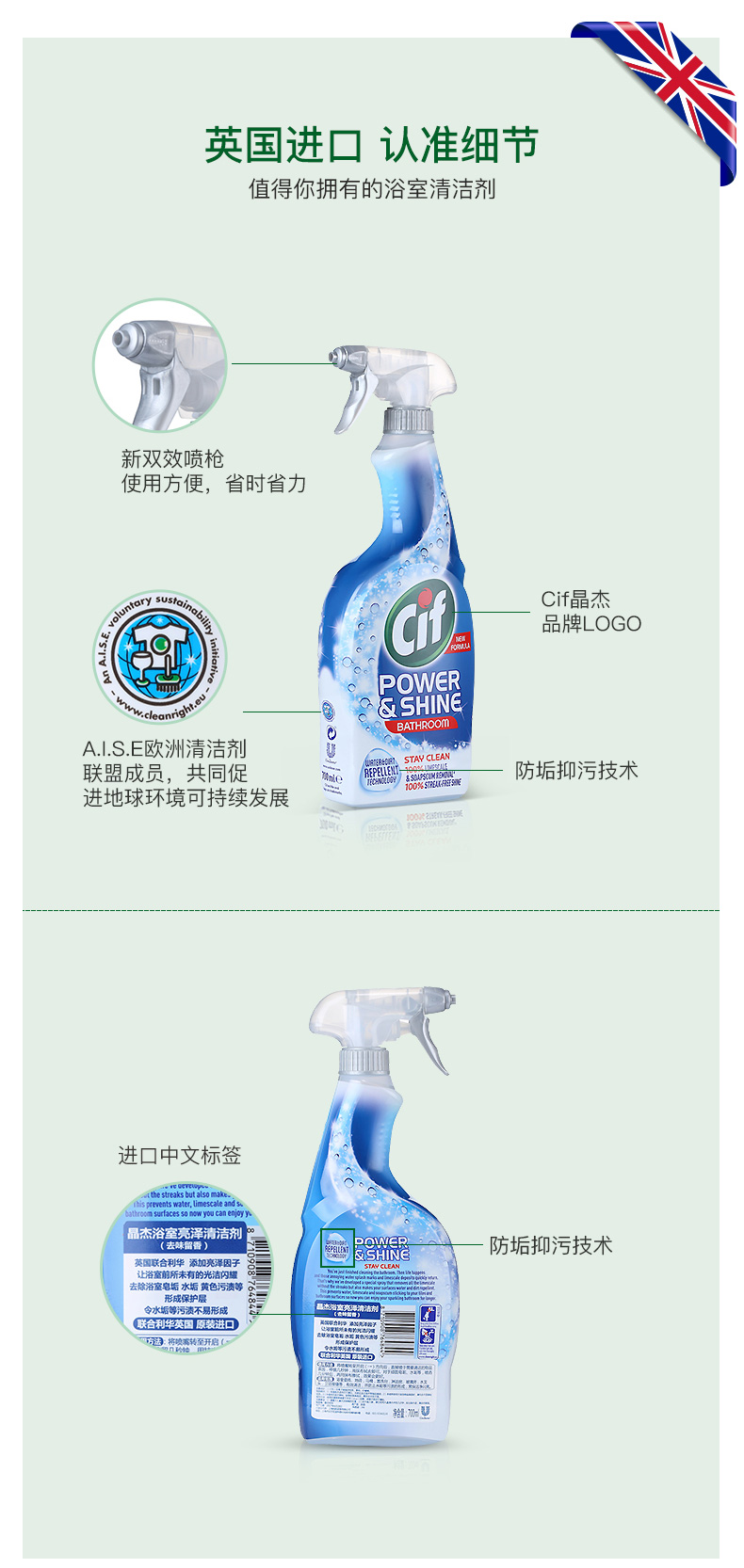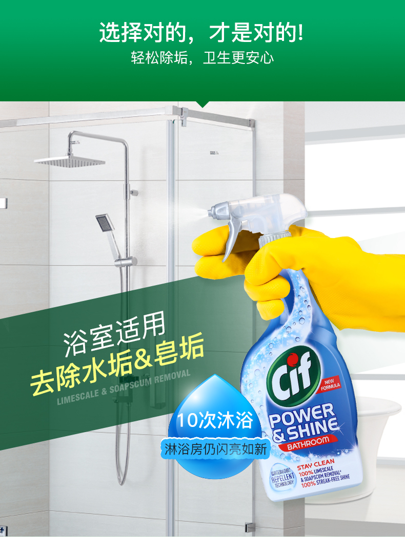 这款晶杰浴室清洁剂,英国原装进口,含有快速清洁配方,一喷一擦,快速分解水垢皂垢污渍,去除浴室尴尬臭味,保持水龙头,洗漱台,浴缸和瓷砖亮洁如新。
