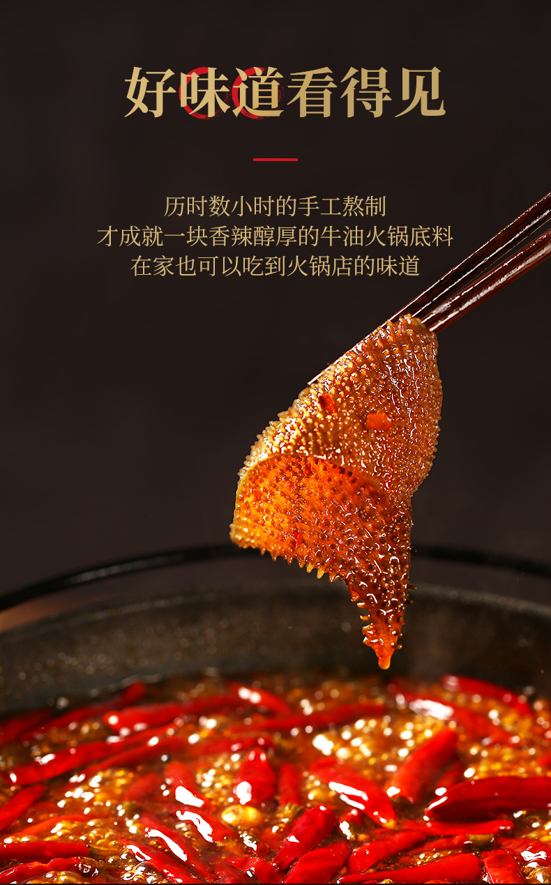 这款臻鲜 微辣牛油火锅底料,正宗四川风味,手工全型,每袋都是手工炒制和等封装。