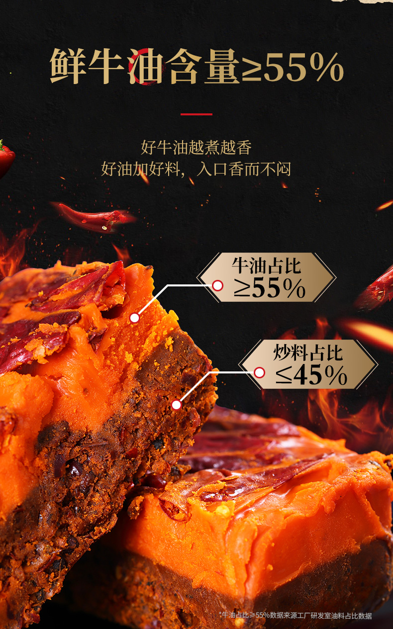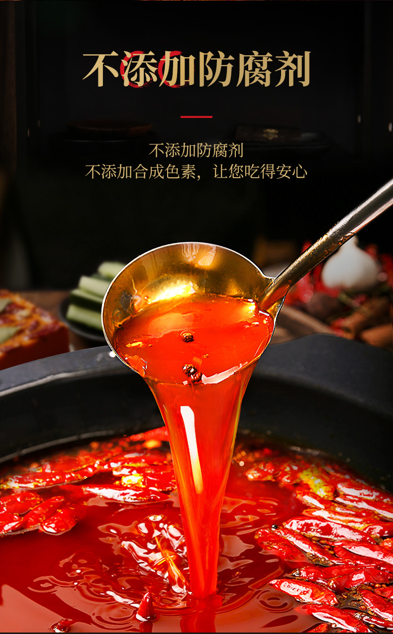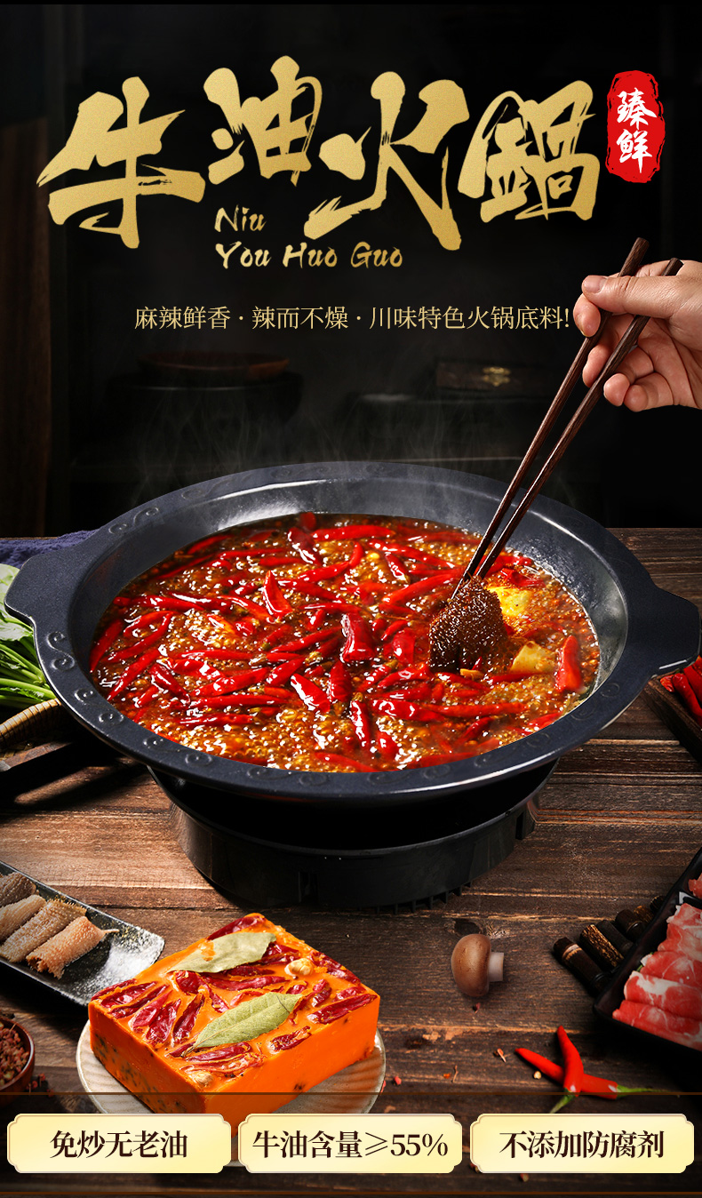 采用优质牛油,香味纯粹,消融后明澈透明,再加入内黄新一代a辣椒、茂汶花椒、郫县豆瓣酱,香味浓郁,使得火锅底汤的色、香、麻、辣、鲜俱全味,秋冬季节最适合吃火锅了,爱吃辣的可以一小小的囤一波。