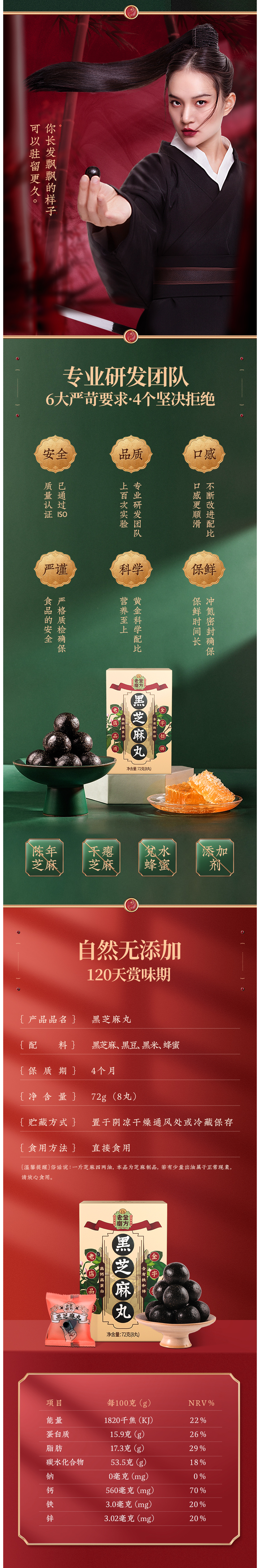 这款老金磨方九蒸九晒黑芝麻丸,由江西黑芝麻、东北黑豆、东北黑米、优质蜂蜜经过九蒸九晒之后制成,具有乌发和延年益寿的作用,不管是自用还是送礼都是不错的选择。