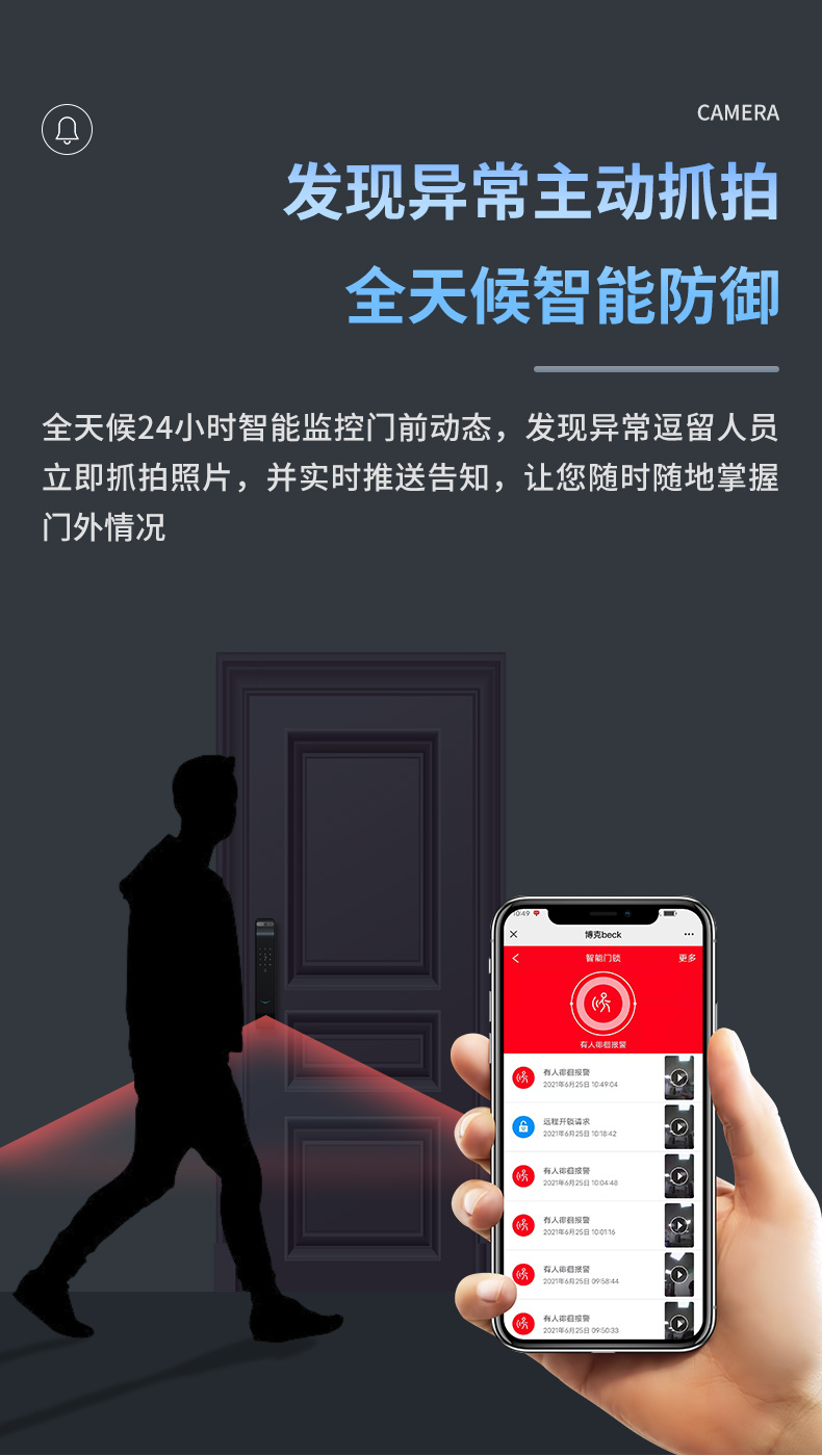 升级猫眼可视对话功能、门铃一按,微信自动推送信息,一键即可实现视频对讲,实用又方便。高清摄像头,120°广角拍摄,智能红外夜视,根据光线自动切换,清洗还原门外影响。全天候24小时智能监控门前动态,发现异常逗留人员,立即抓拍,并实时推送,让您随时掌握门外情况。
