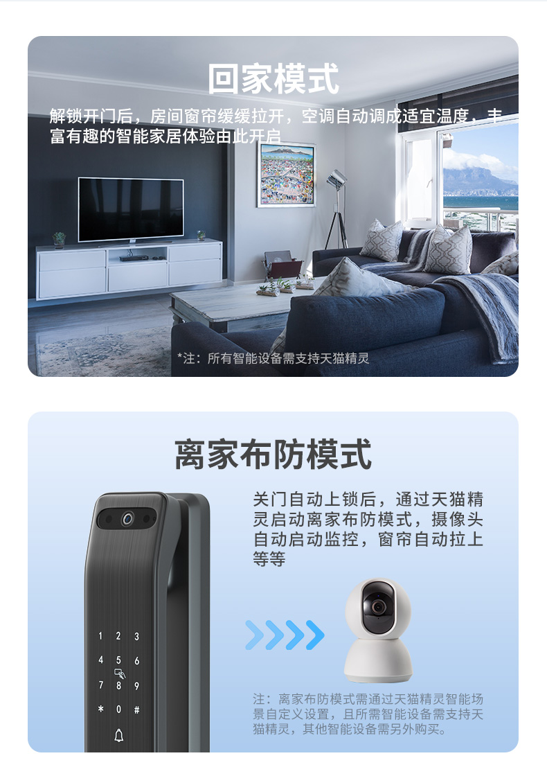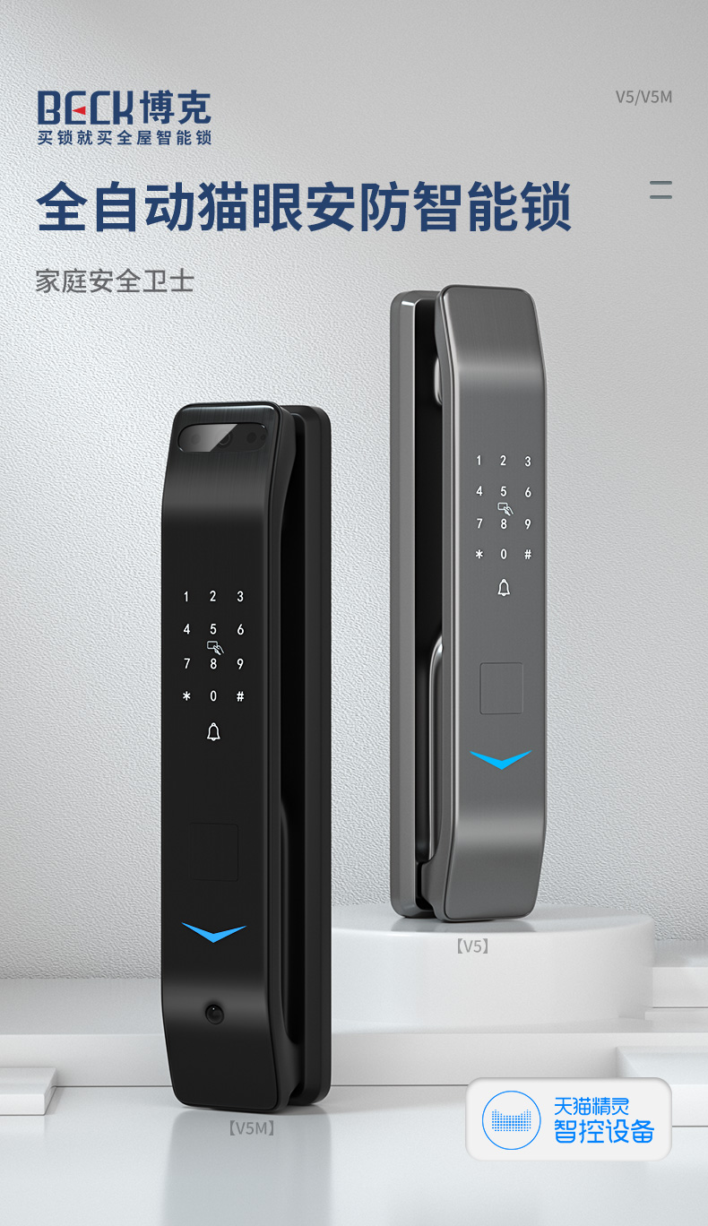 这款V5M 智能指纹锁 是V5的升级款,联合天猫精灵APP实时一站式管理,门锁状态、电量情况、用户管理、临时密码,开门记录和报警情况,实时查看,记录查询,钥匙管理一手掌握。