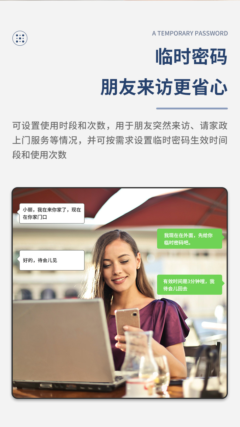 另外临时密码可设置使用时段和次数,用于朋友突然来访、请家政上门服务等情况,并可按需求设置临时密码生效时间段和使用次数。