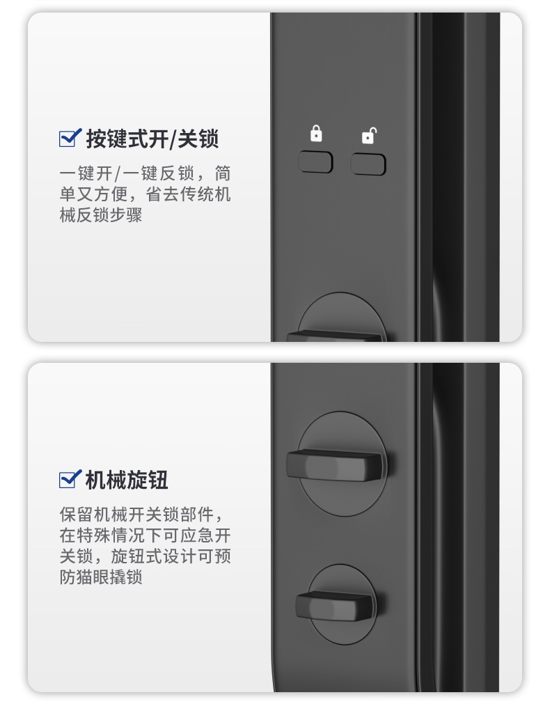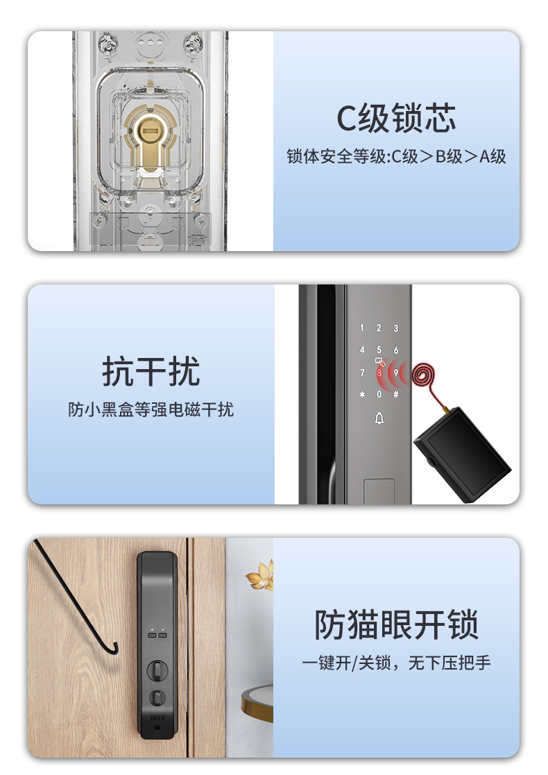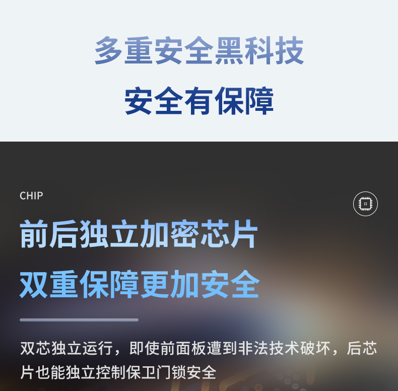 安全方面:采用双芯独立运行,即使前面板遭到非法技术破坏,后芯也能独立控制包围门锁安全,不惧“小黑盒”非法开锁。虚位密码,防偷窥防试开,密码、指纹、磁卡多次输错、暴力撬锁,会触发声光报警,并向主人手机发送报警信息,5000毫安锂电池,可反复充电,环保又方便。