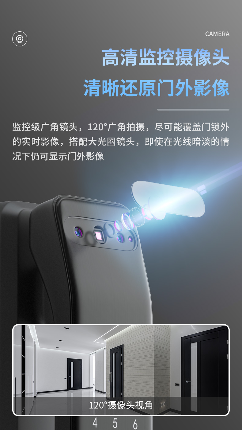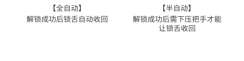 全自动解锁开门,一触即开急速识别,无需推拉或下压把手,可设置10-99秒自动反锁,自适应学习算法,越用越灵敏,识别率高达99%,相应时间≤0.1秒。