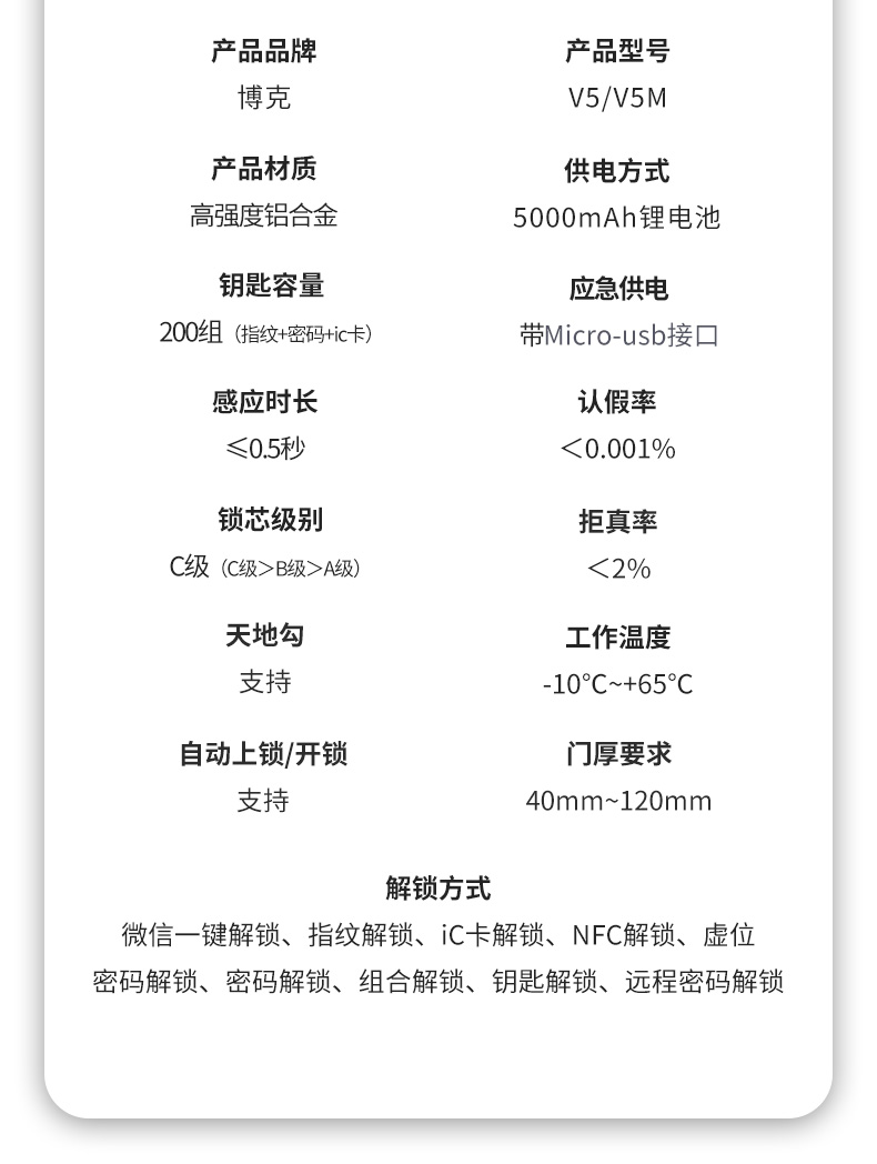 开锁方面:除了指纹、密码、32位虚位密码、IC、临时、NFC、钥匙、组合(密码+指纹)多种常规开锁方式,V5M 还增加了微信远程解锁功能,远程解锁更方便。