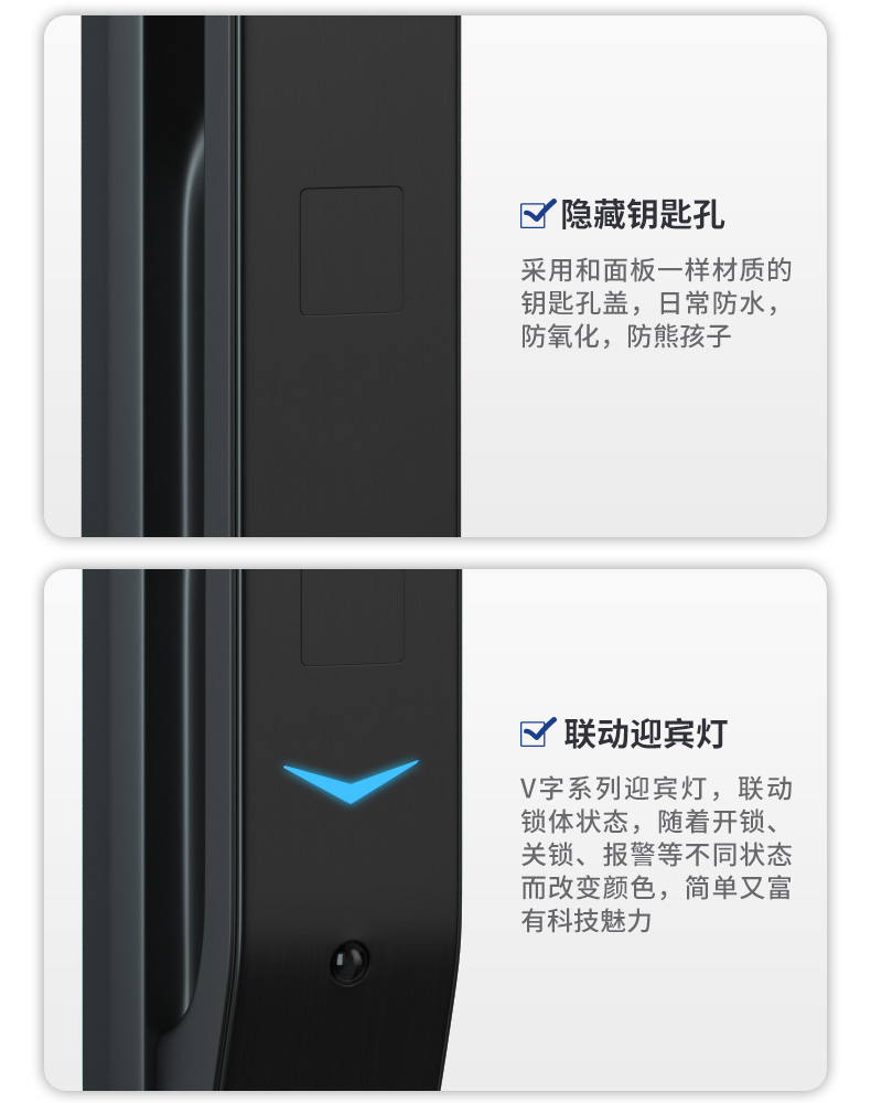 V5M智能锁 美观的桥型构造,磨砂面板带背光,瑞典FPC半导体指纹采集器,指纹头隐藏设计,设置在把手后面,防止指纹区被划损,起到保护作用,指纹区凹凸设置,仅凭手感便能快速找到。