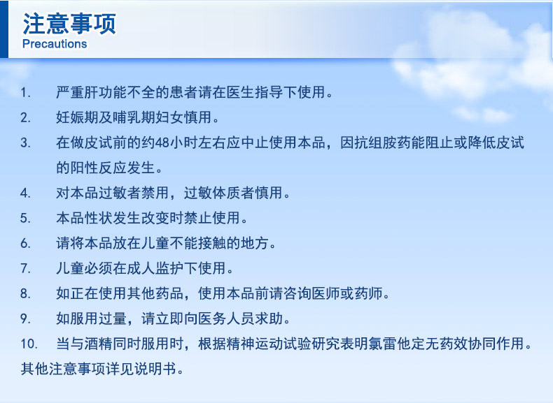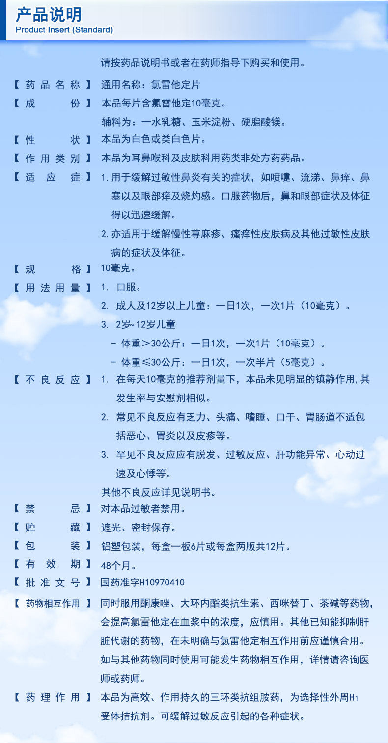 氯雷他定(loratadine),是第二代的抗组织胺药物,常用于治疗过敏症状。和第一代抗组织胺药相比,它的一大特性是无瞌睡作用。用于过敏性鼻炎、急性或慢性荨麻疹、过敏性结膜炎、花粉症及其他过敏性皮肤病。