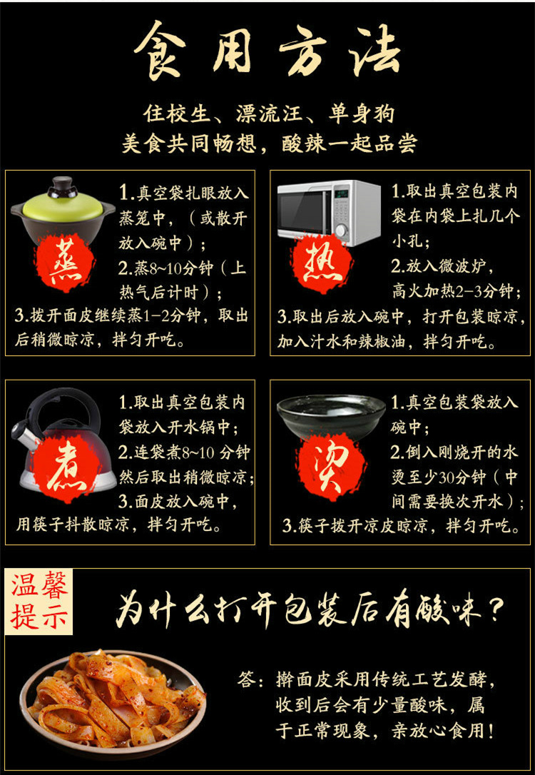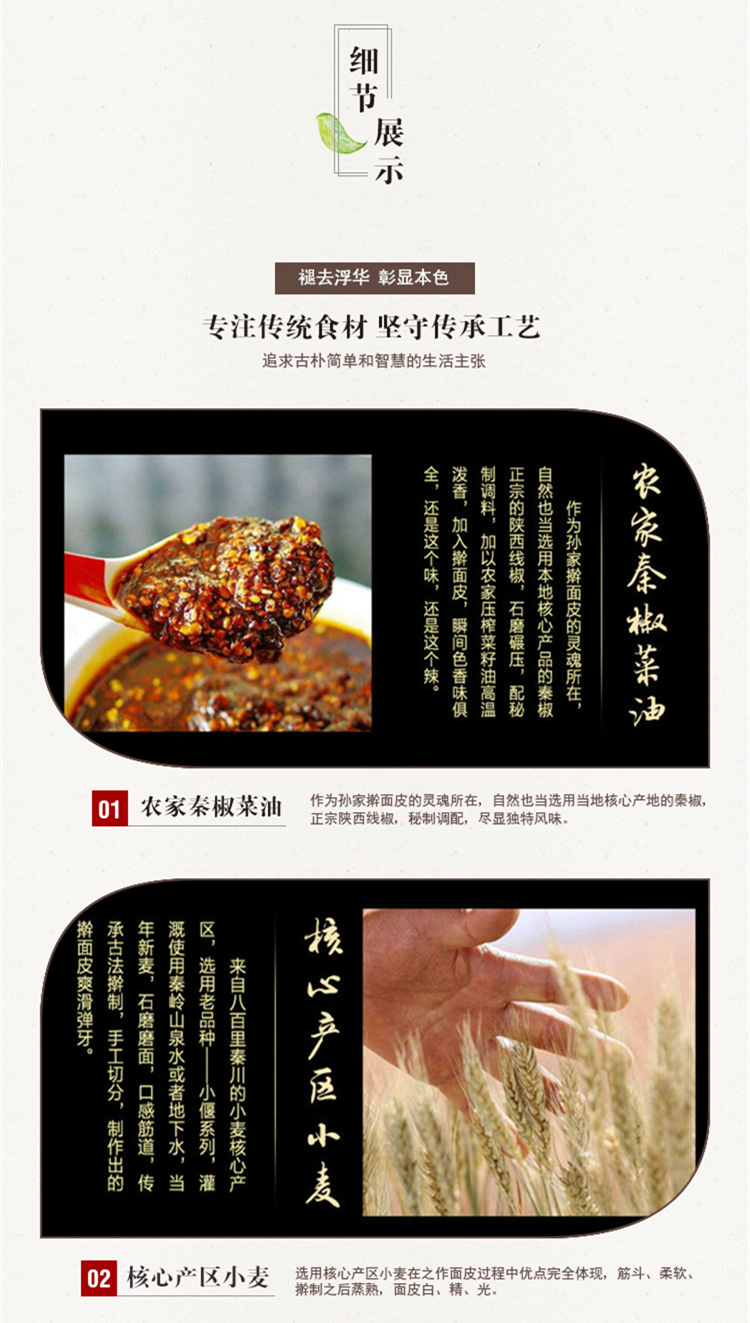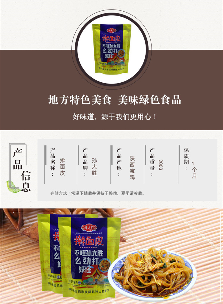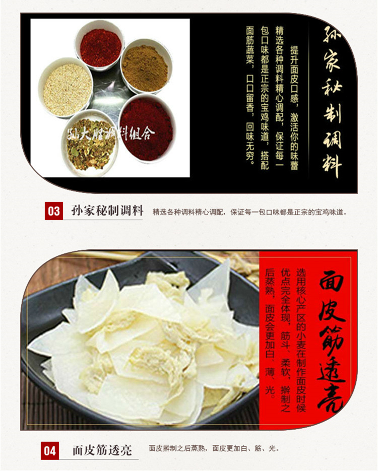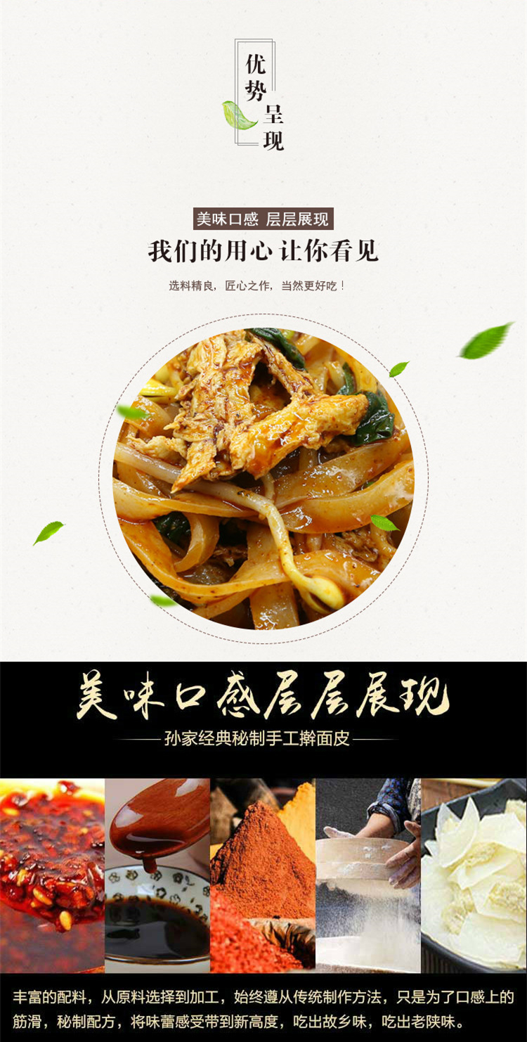 西安特色擀面皮,优选八百里秦川的小偃系列小麦,经过石磨磨面,口感劲道,传承古法擀制,手工切分,制作出的面皮爽滑弹牙,搭配孙家秘制调味料,香辣不燥,油而不腻,到手后蒸、煮、烫、微波均可,第一次制作更推荐煮。