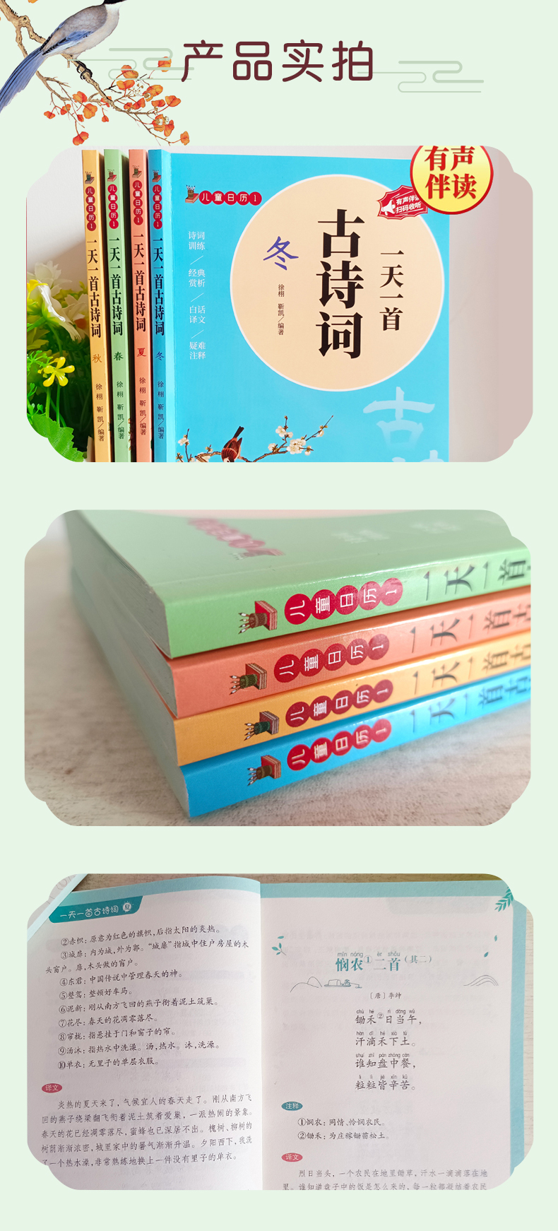 天猫日升图书专营店22.8元,可领10元优惠券,实付12.8元到手,是正价88元的1.5折;孩子一生必读的古诗词书,全套4册,注音版,春夏秋冬一天一首古诗词,还是有声伴读的哦!全文注释译文,无障碍阅读,还有练习,学练结合,让孩子多读古诗词,提高语文水平领券链接点此