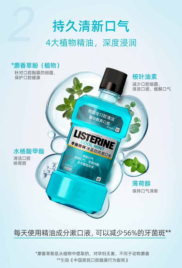 李施德林漱口水,可深入清洁口腔内部难刷部位,杀灭隐藏在牙缝间及刷牙后残留的细菌,比单靠刷牙更能有效减少牙垢膜及牙龈炎的形成。