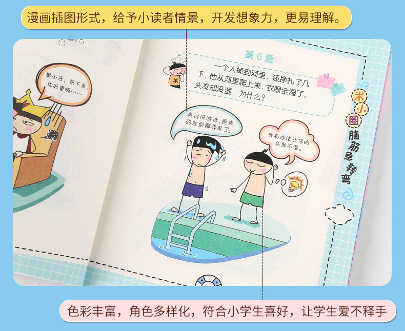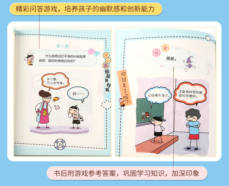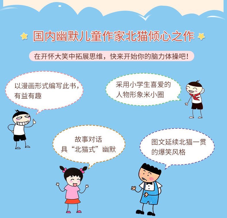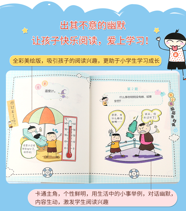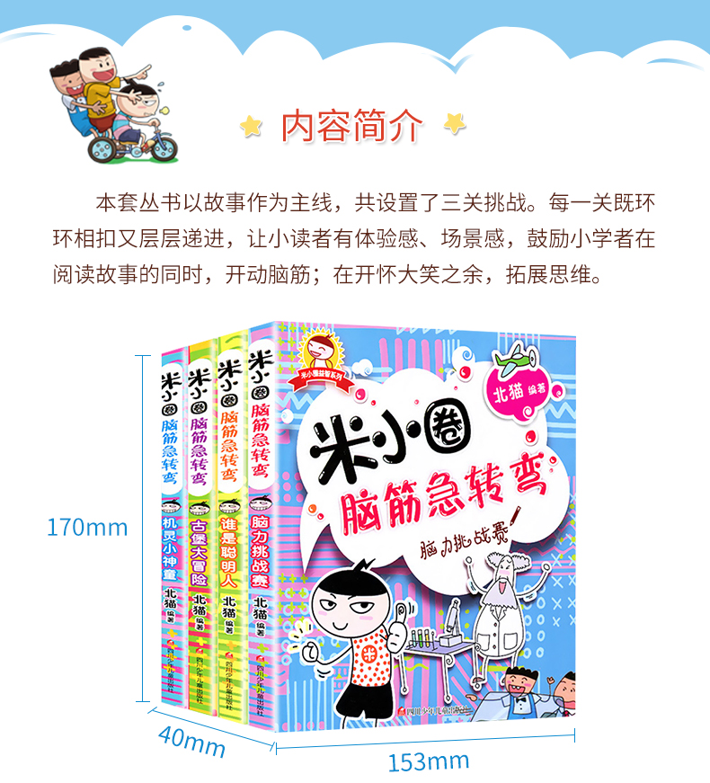 继《米小圈上学记》畅销280万册后,“米小圈”家族又添新成员——调皮可爱的米小圈有故事的《脑筋急转弯》智力大闯关。共包含《脑力挑战赛》、《机灵小神童》、《谁是聪明人》以及《古董大冒险》四本书,彩色幽默漫画,延续“米小圈”系列爆笑风格。便携本,小朋友比较方便携带。每本脑筋急转弯共设置了三关,用一个故事作为主线串联,按照冲关挑战的方式进行。 三关既环环相扣又层层递进,让小读者有体验感、场景感,鼓励小读者在阅读故事的同时,开动脑筋;在开怀大笑之余,拓展思维。