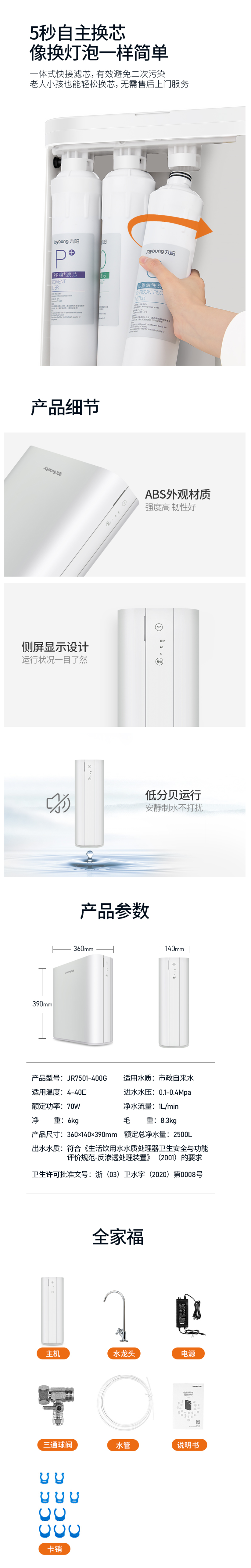 这款九阳JR7501 RO反渗透直饮净水器,是19年的新品,拥有5级精滤,升级版13寸加长滤芯,比普通的8寸滤芯,使用寿命更长(延长了一倍),净水量也更多。