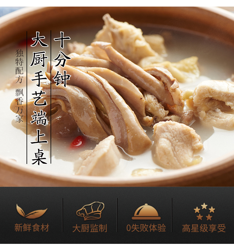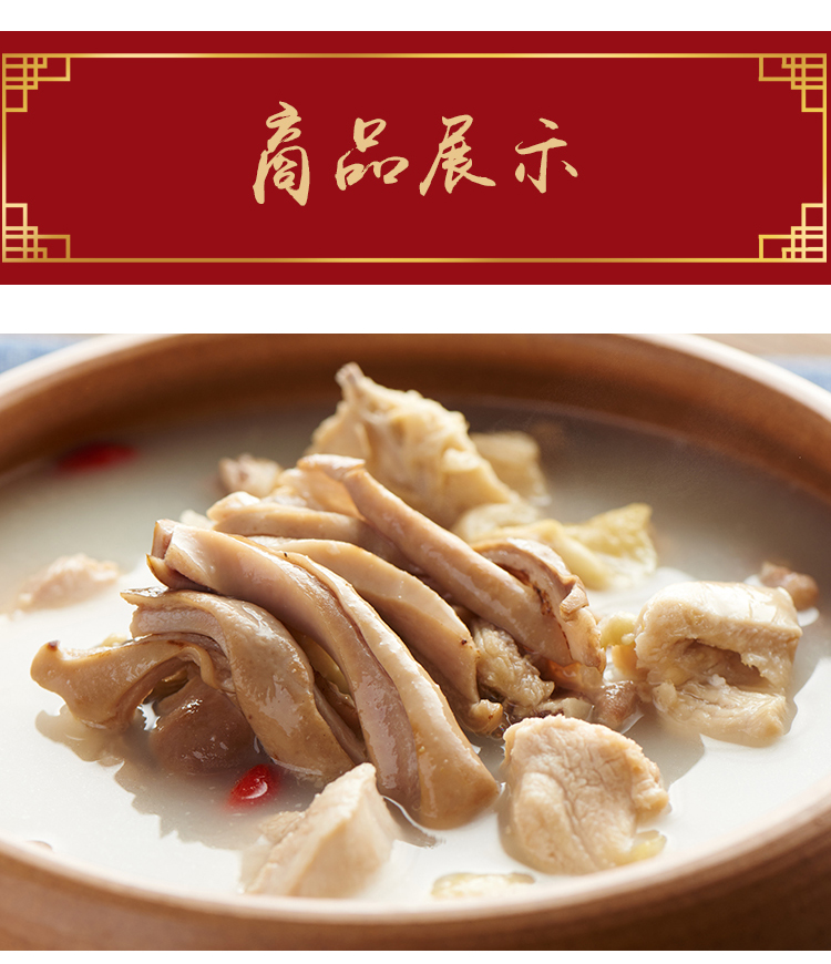 这款王府邦瑞胡椒猪肚鸡优选鲜嫩鸡腿肉和弹牙猪肚,融入慢熬浓汤,由五星级酒店厨师监制,鸡肉鲜香爽滑,猪肚爽脆弹牙,配上辛香胡椒和枸杞,别有一番风味,可直接当作一款汤品,也可添水当作一顿滋补的涮锅,食用非常方便。