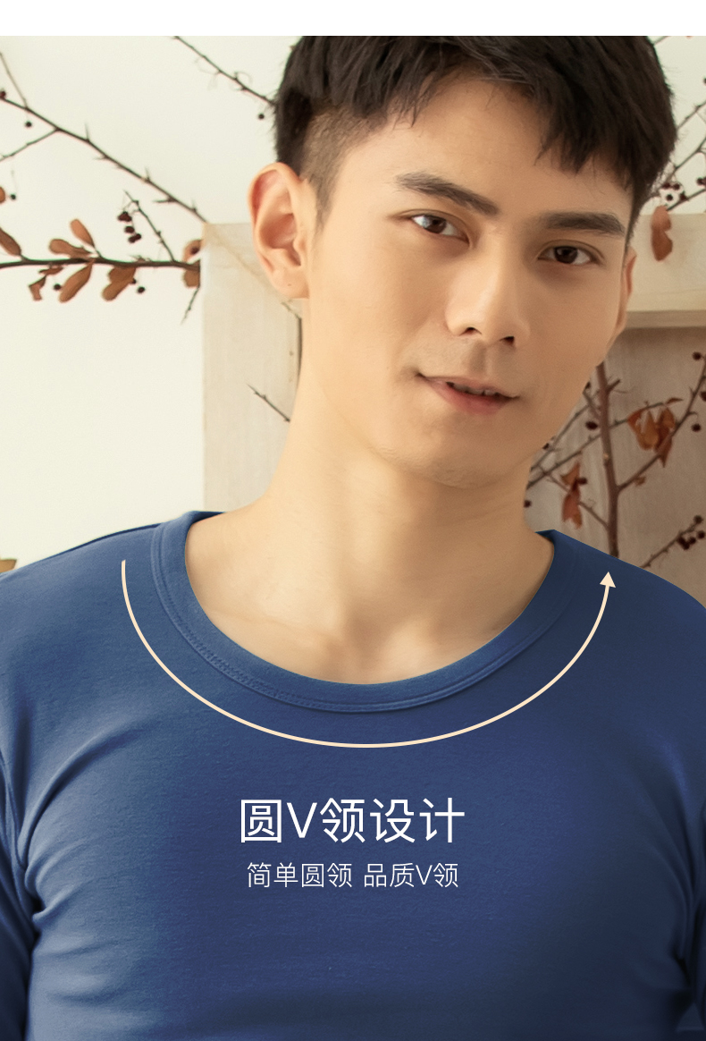 这款秋衣套装,采用100%纯棉40支纺纱面料,180克重薄厚适中,柔软亲肤,不掉毛,手感细腻,透气有弹性,不易起球,活性印染,一片式剪裁,3D人体工程学设计,穿着舒适不易变形,双包滚边圆V领,贴肤罗纹袖口及脚口,罗纹裤腰,无钮扣门襟。