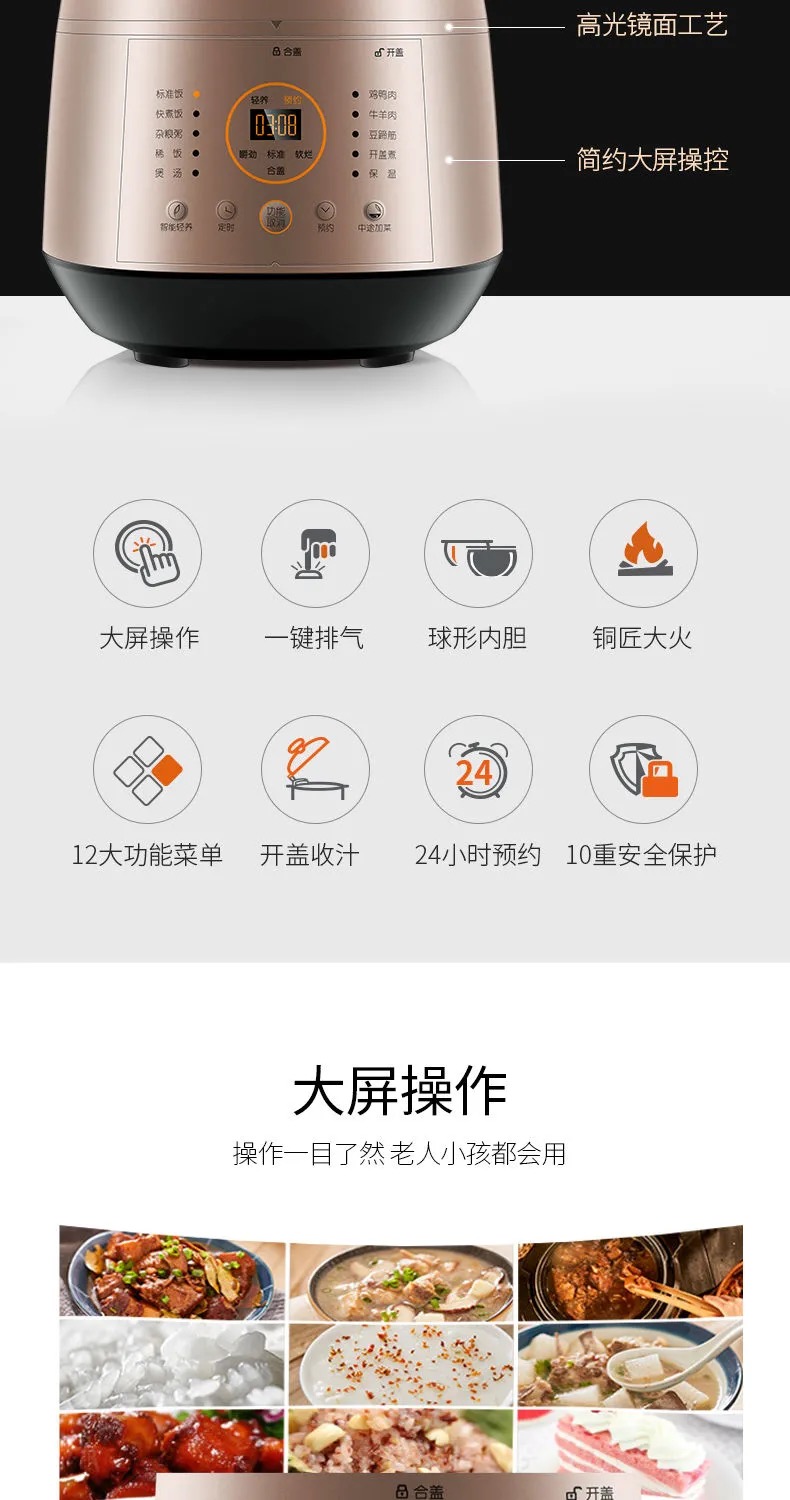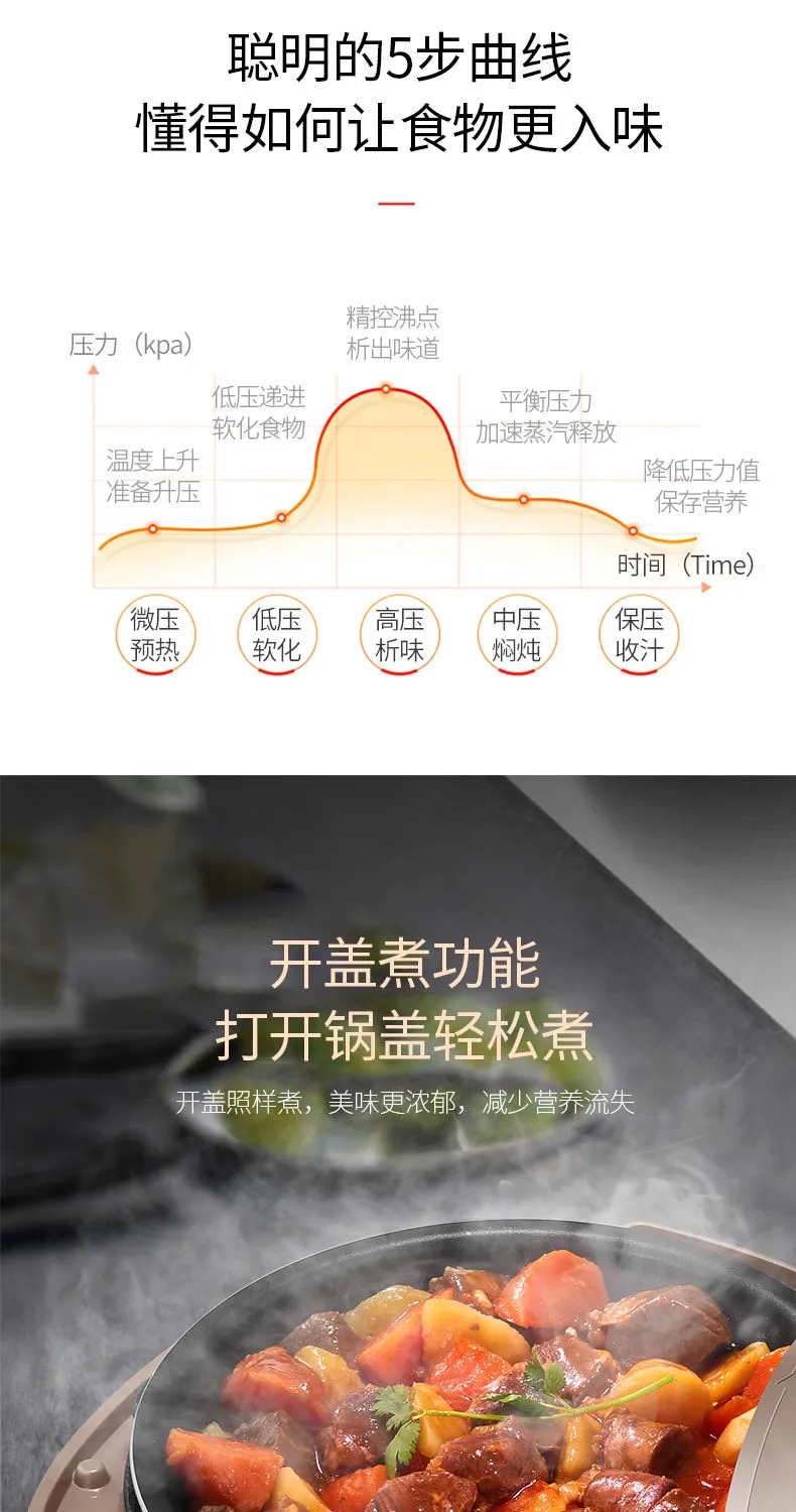 操控方面,采用了触控大面板,一目了然,14大菜单,4种一键烹饪。还支持开盖煮,适合煮面、火锅。烹饪完成可以一键排气,防烫手。该款压力锅支持24小时预约保温,方便节约时间。参数方面,额定功率800W,产品容量5L,压力70Kpa。