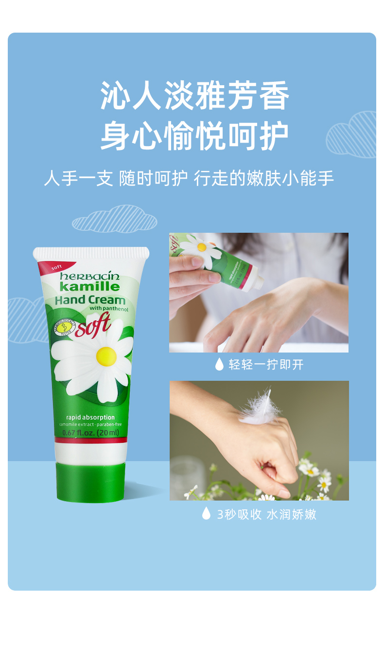 德国小甘菊护手霜,精选的滋养成分萃取的甘菊精华、植物性甘油精华和保护性硅树酯,滋润皮肤修复粗糙和有皱裂的皮肤,使皮肤柔韧平滑,被香港杂志评为100个值得拥有的化妆品之一,使用后清爽不油腻,更是成为日本杂志常见的座上客。
