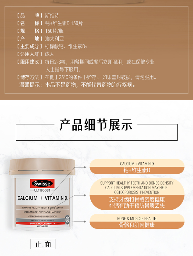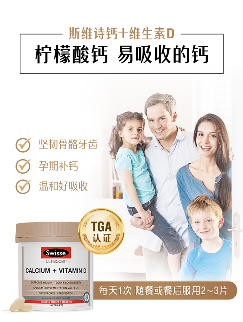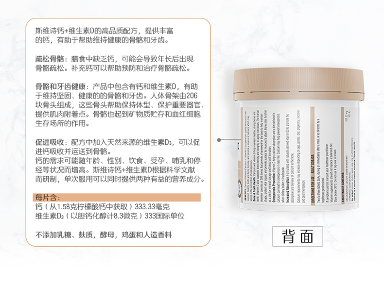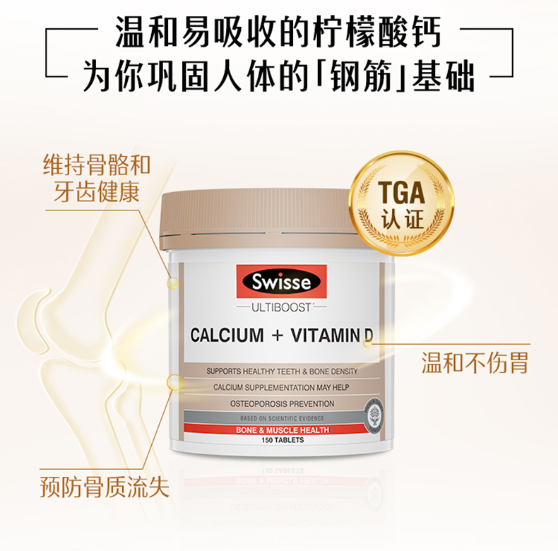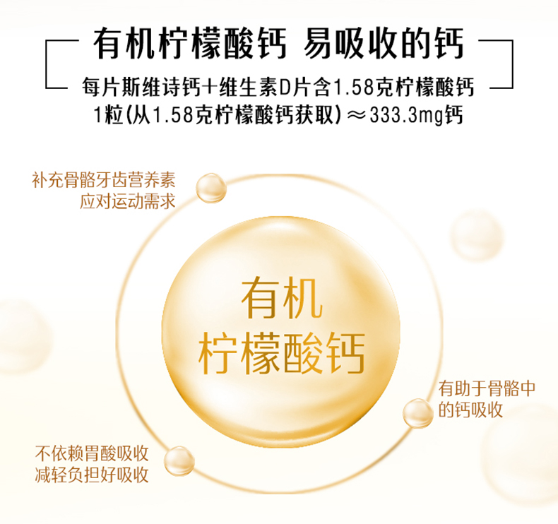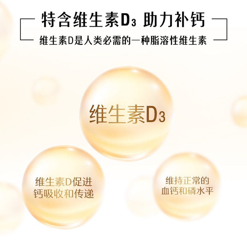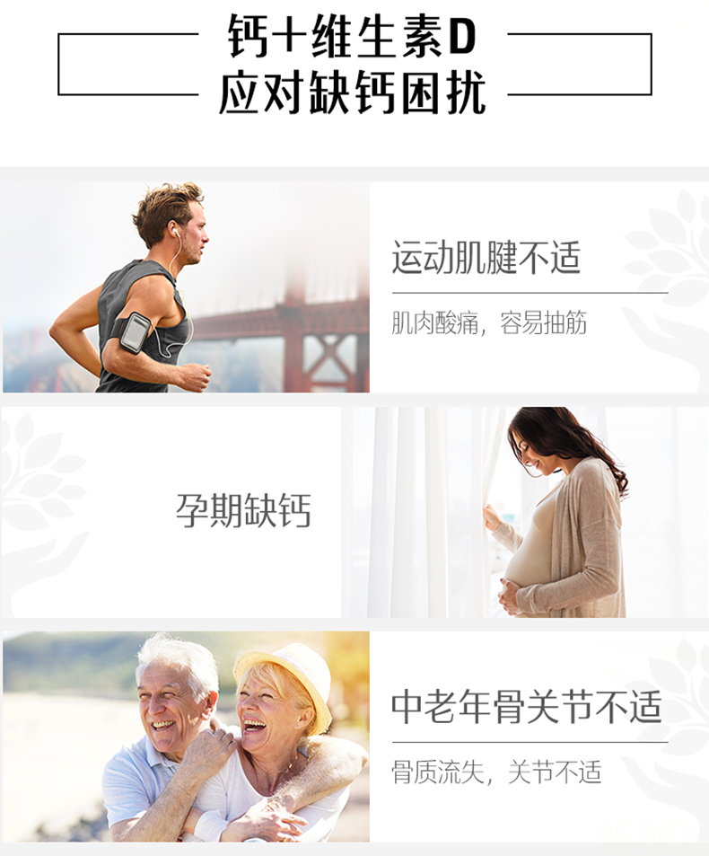 这款钙片含有天然钙和维他命D3,维他命D3协助钙质吸收。能够防治骨质疏松、骨折、腰酸背痛、抽筋、驼背、高血压、失眠、痛经、情绪不稳定等症状,调节心脏节律,有助于维持正常血液凝固,预防儿童佝偻病,成年人软骨症和骨质疏松,对中老年人的身体具有明显改善作用。规格150粒