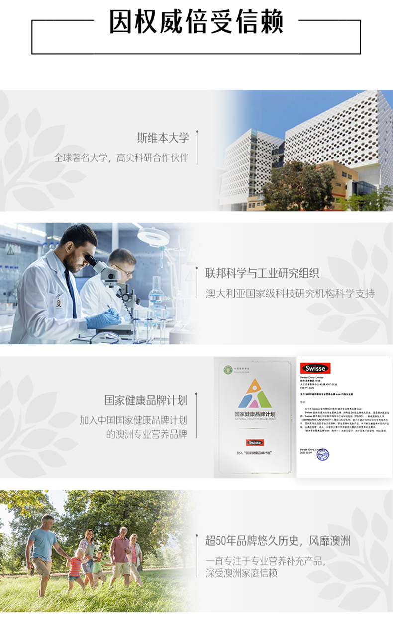 Swisse公司始创于本世纪50年代末成立于澳大利亚墨尔本,澳洲自然医学疗法的先驱之一。超过25年的科学研究和临床试验的基础,澳洲最知名的保健品牌,其原料采购和生产工艺均通过全球最高处方药的生产标准TGA。这个牌子的保健品在澳洲还是比较出名的,之前几年没有天猫国际的时候,很多朋友都是代购这个牌子的保健品。