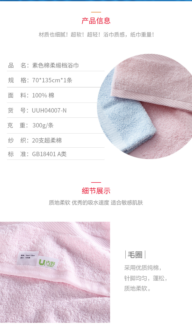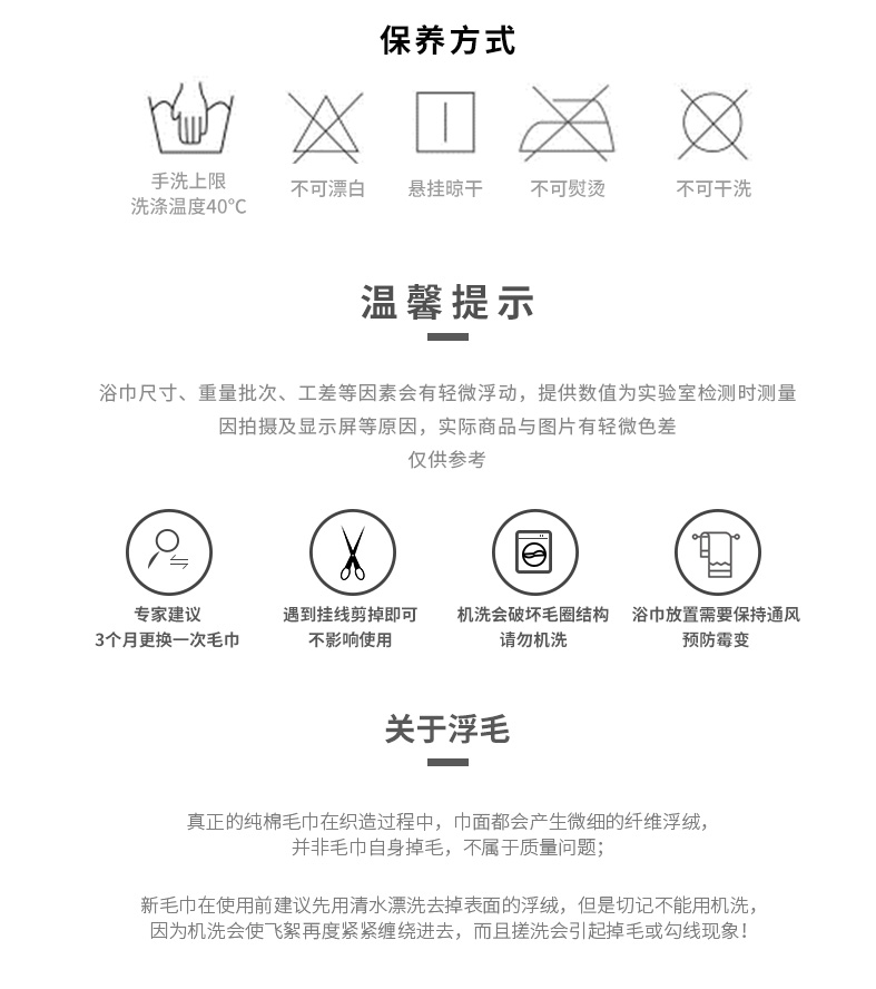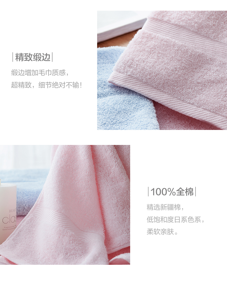 这款浴巾,100%新疆长绒棉面料,传承日本百年工艺,毛圈质地柔软、细腻,具有优秀的吸水性,适合敏感肌肤,精致缎边,针脚均匀蓬松增加了浴巾质感,鲁道夫3A级抗菌,抑菌率高达99%,有效抑制细菌,不易产生异味,反复水洗依然柔软。