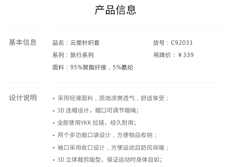 这款君羽休闲连帽卫衣是18年的春季款,属于旅行系列的针织外套,采用95%聚酯纤维混5%弹力纤维的混纺面料,质地轻薄有弹性,舒适凉爽透气,适合初秋、或者早晨外出运动时穿;