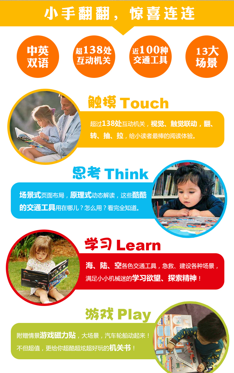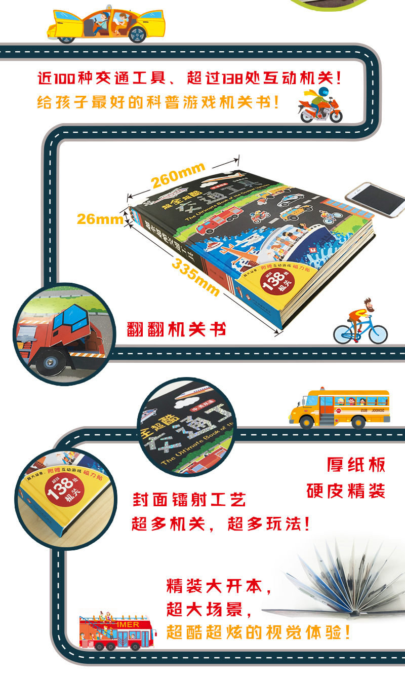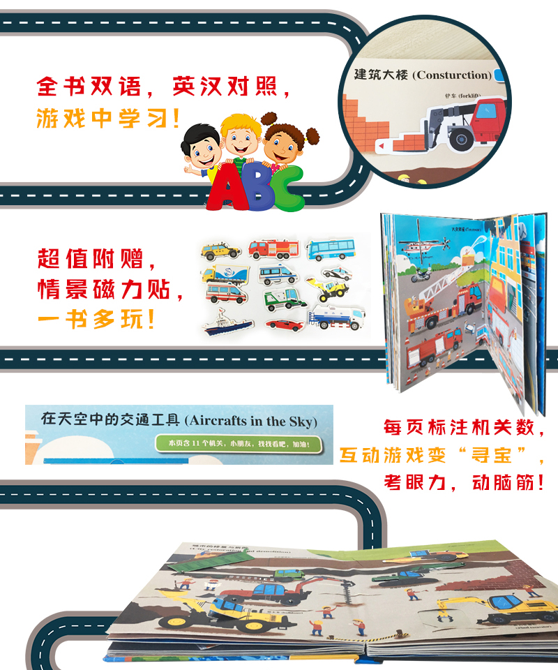 游戏:附赠情景游戏磁力贴,大场景、汽车轮船动起来,不但超值,更有超酷超炫超好玩的机关书。