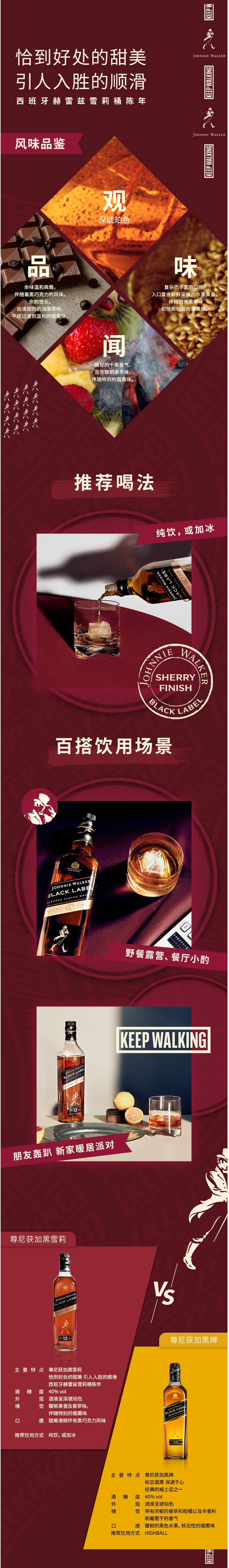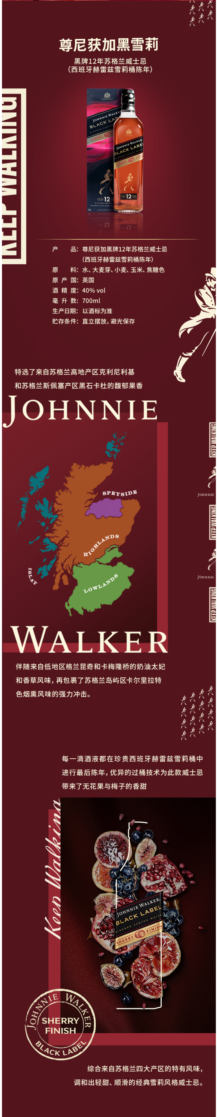 这款尊尼获加Johnnie Walker 黑雪莉 黑牌12年苏格兰威士忌,英国原产,由尊尼获加首席调配大师吉姆.贝弗里奇携团队悉心打造,手工臻选桶陈单一麦芽威士忌酒液进行悉心调配,继而置于西班牙赫雷兹雪莉桶中进行最后陈年,优异的过桶技术为此款威士忌带来了无花果与梅子的香甜。