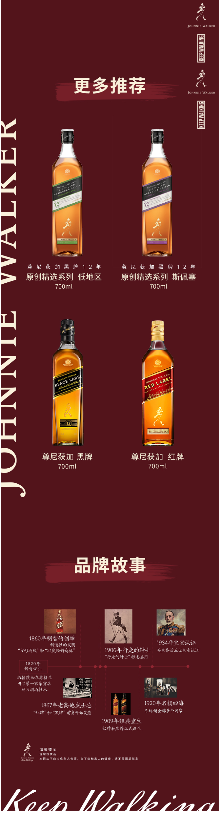 JOHNNIE WALKER尊尼获加是全球著名的苏格兰威士忌品牌,拥有200年的历史。旗下威士忌跟居市场定位不同,酒标分为红、黑、醇黑(双黑)、绿、金、铂金、蓝色,因方形瓶型也被称为红方、黑方、绿方.......每款酒使用的基酒、陈酿时间、口感、风味特点各不相同。