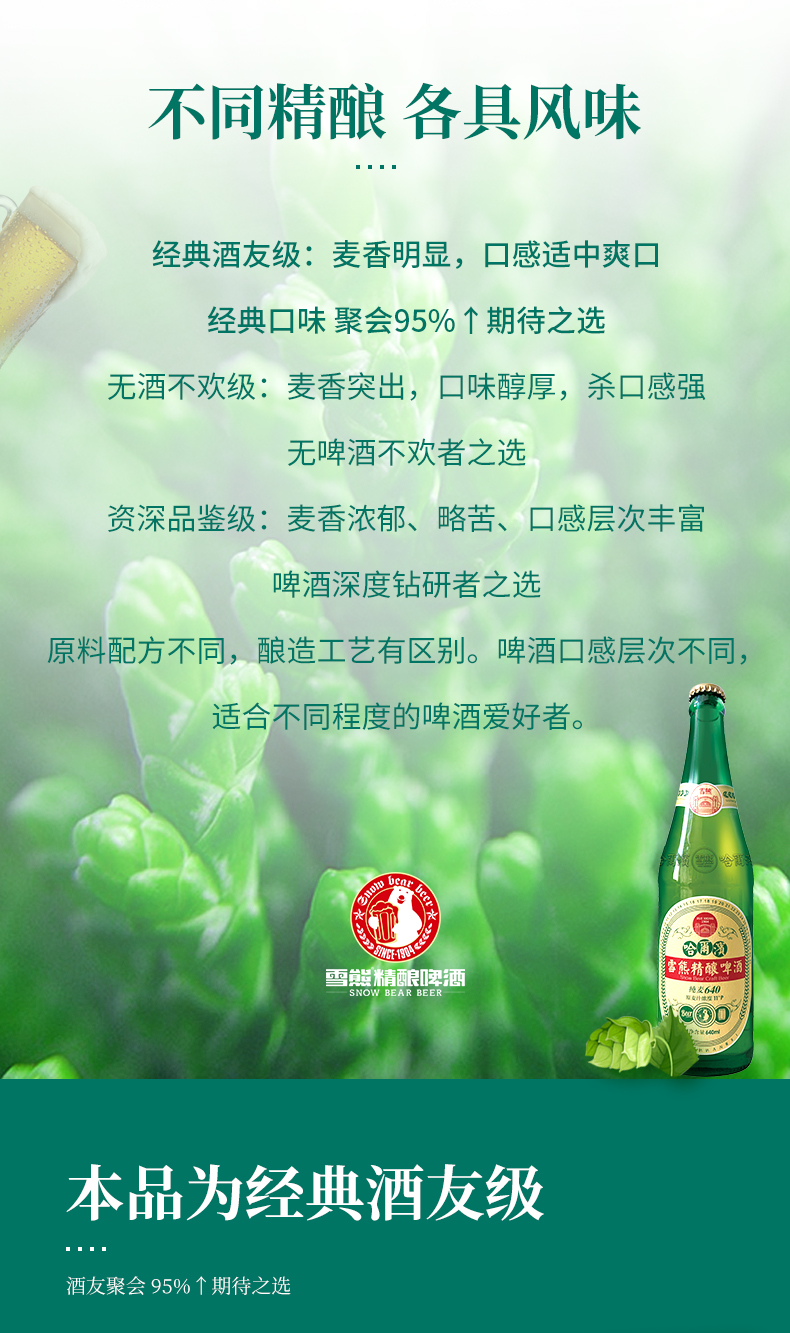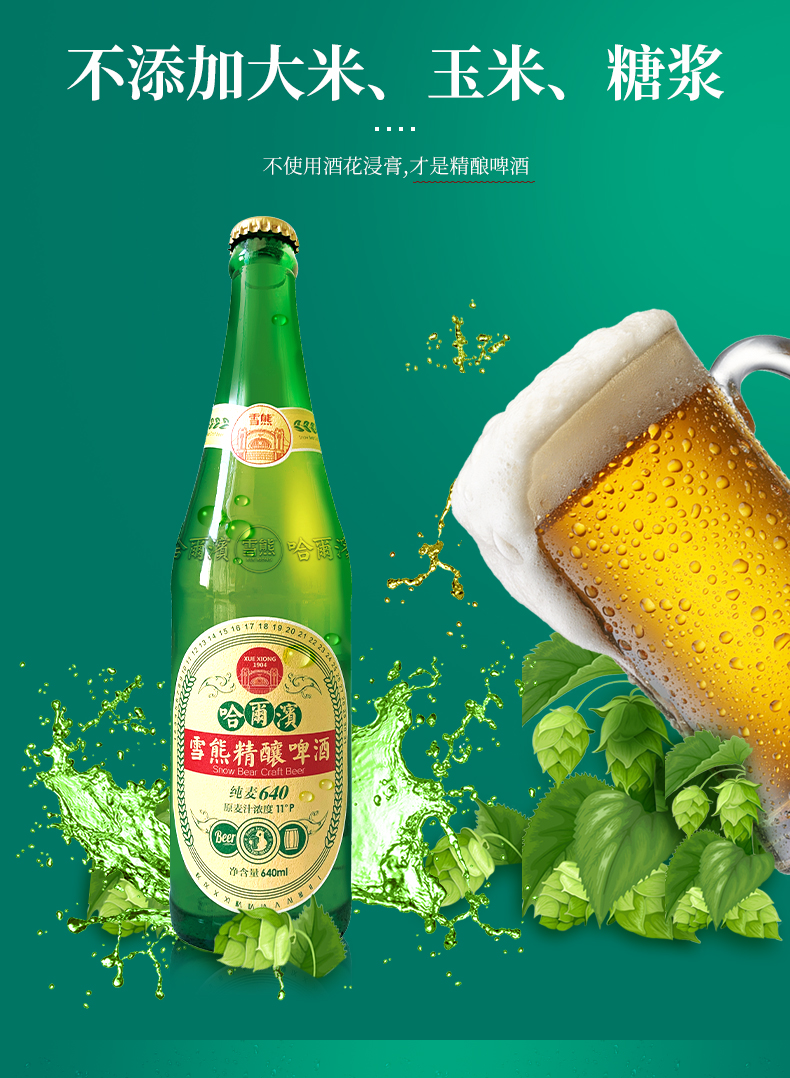 这款雪熊精酿 哈尔滨大绿棒子啤酒,规格:640ml*12瓶,酒精度 ≥3.7%VOL,不添加大米、玉米、糖浆,不使用酒花浸膏,才是精酿啤酒;优选原料遵循德国1516啤酒酿造纯净法酿造,优良水源层层净化,进口麦芽提高啤酒的麦芽香气,泡沫如牛奶般洁白细腻;独特芳香的啤酒花,顺滑爽快的微苦和愉悦的酒花香。