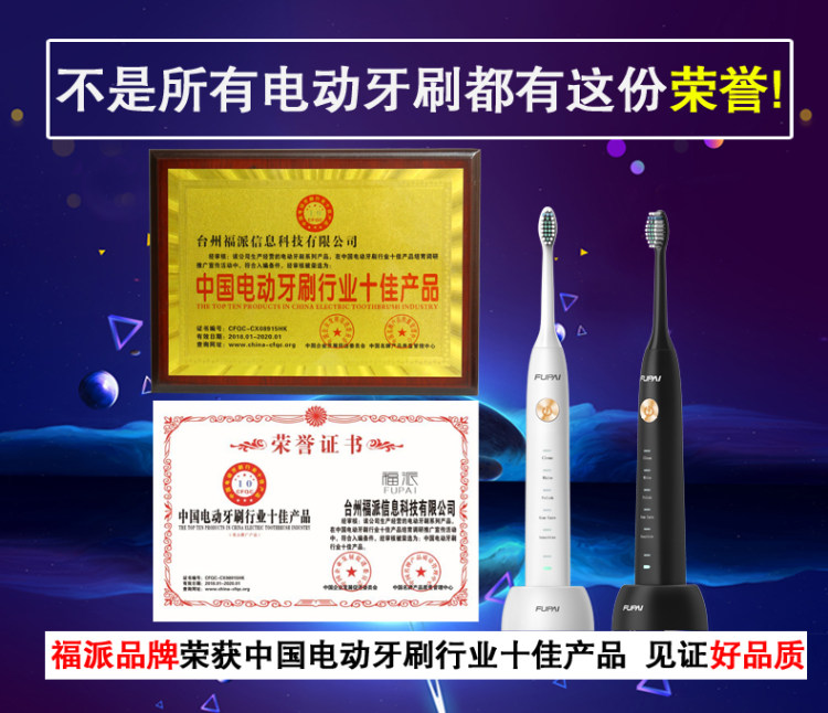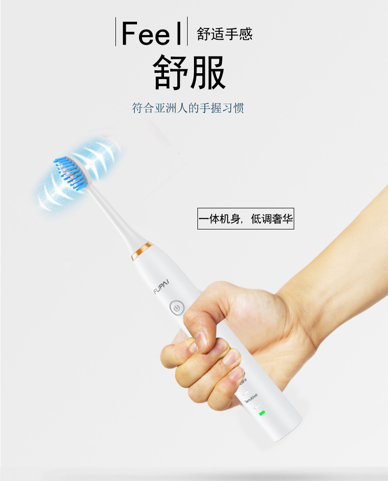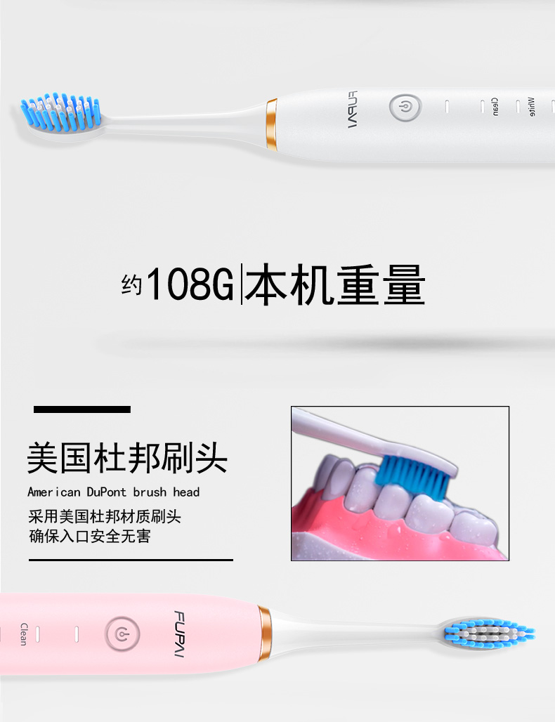 这款福派 A6 plus 充电式 成人声波电动牙刷,是升级款,高频声波技术,所产生的微气泡,冲刷牙缝口腔死角;五档刷牙模式,自上而下,清洁模式,美白模式,抛光模式,牙龈护理模式,敏感模式,低频、中频、高频,三种频率表,共15种档位,可以根据各人不同的口腔环境,进行选择。