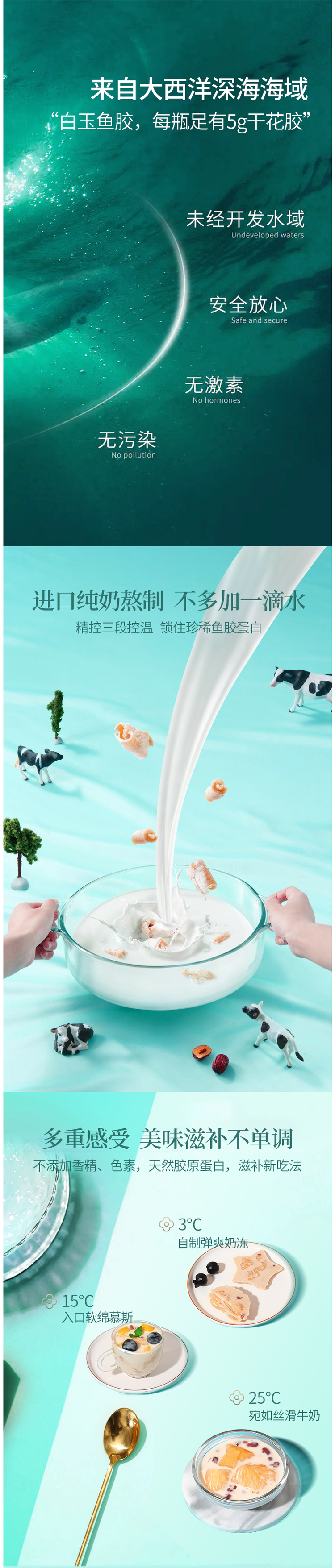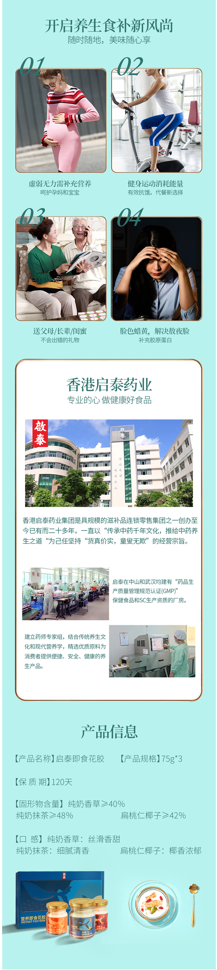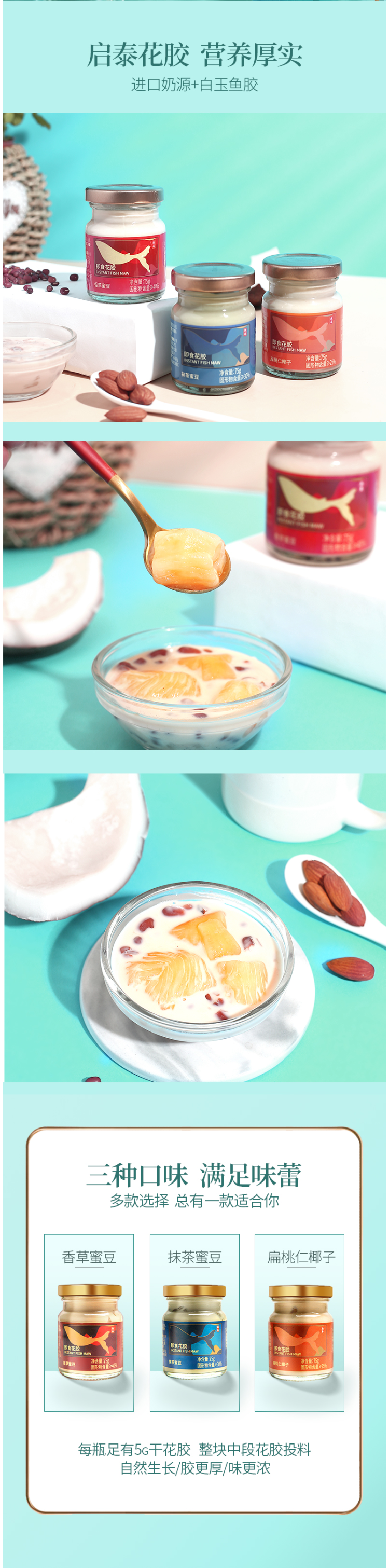 这款香港 启泰 即食花胶奶冻,使用深海白玉鱼胶和进口奶源制成,每瓶中有5g整块中段干花胶为主料,搭配进口纯奶熬制,不多加一滴水熬制,无香精、色素添加。