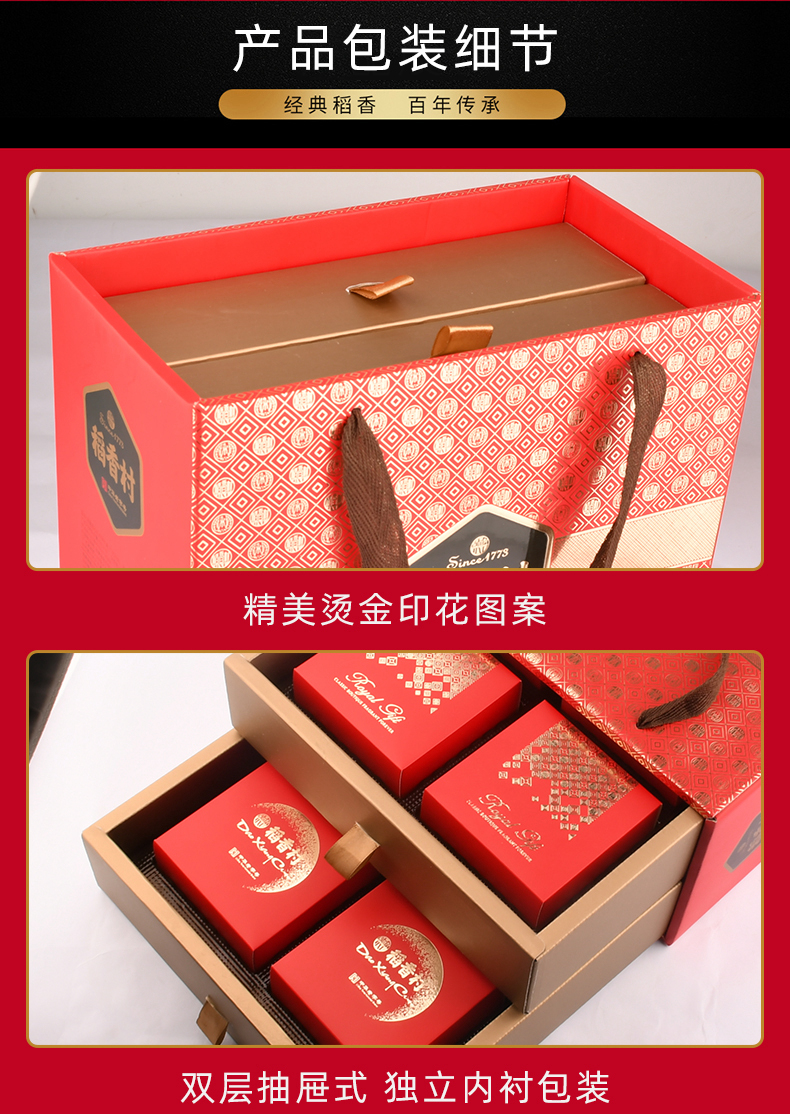 这款稻香村 中秋月饼礼盒,包含蛋黄莲蓉100g*2枚、奶油椰蓉100g*2枚、金丝枣蓉100g*2枚、玫瑰豆沙100g*2枚,包装和上是精美烫金印花图案,双层抽屉式,独立内衬包装,看着非常高端。