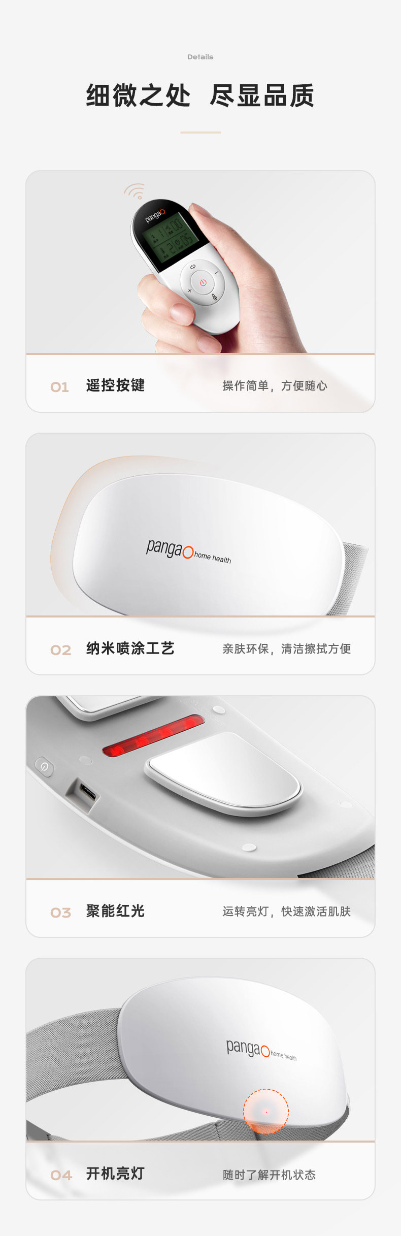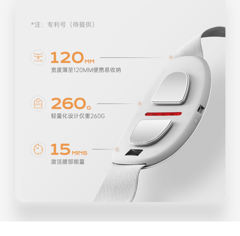 模拟真人按摩 16档可调,红光+脉冲+热敷同步作用效果加倍。人体工程学设计,精致美观,12mm纤薄机身仅有260g,贴合腰腹部曲线,可调节腰带魔术贴贴合,轻盈舒适,长时间佩戴也无压迫感。内置1500mAh锂电池,续航持久。