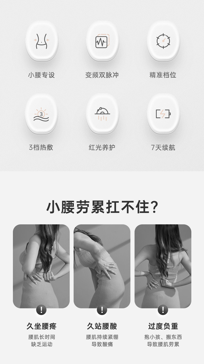 常规脉冲只能舒缓表层酸痛不适,攀高小蛮腰采用VTP双脉冲变频技术,搭TENS+EMS脉冲功能,在舒缓不适的同时焕活锻炼肌肉,给你双倍舒适。