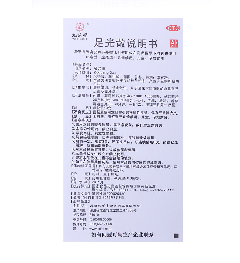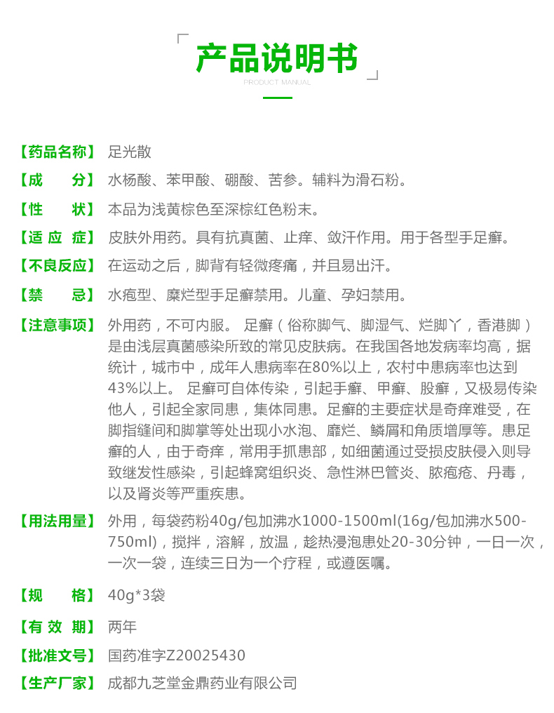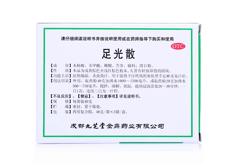 这款九芝堂足光散专治脚臭脚痒、足部脱皮、皮肤硬化以及角化型足癣,国药准字OTC标,使用时将其倒入沸水,带沸水放温后趁热浸泡,1日1次,1次20-30分钟。