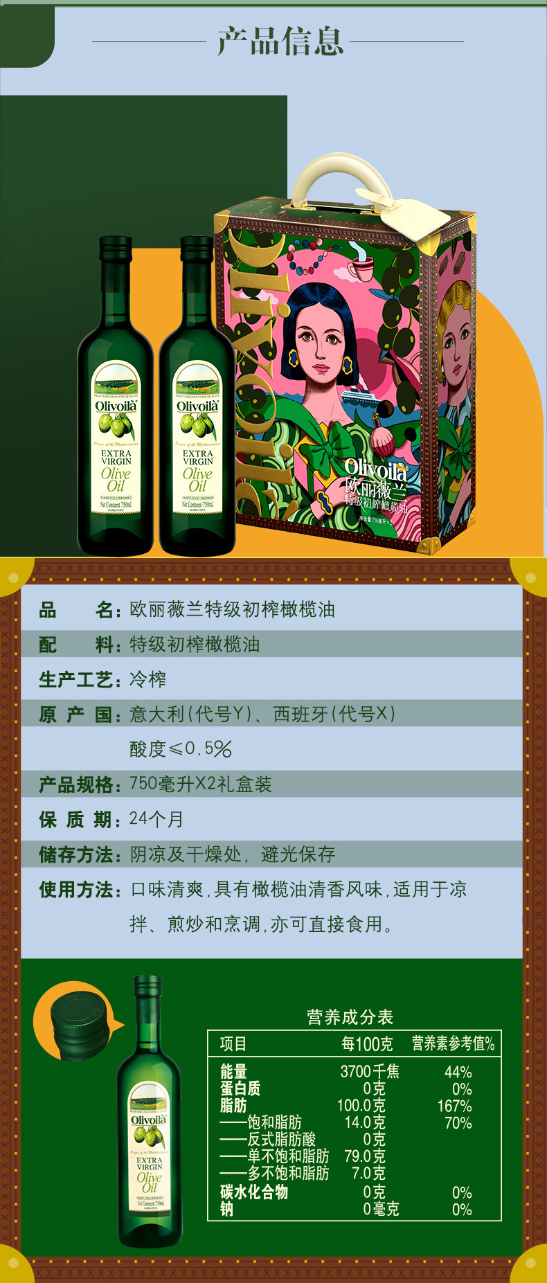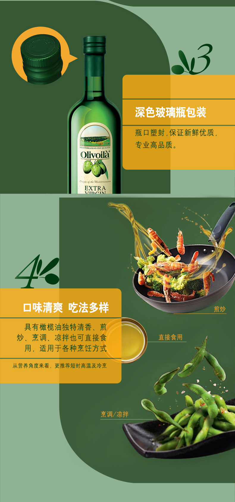 欧丽薇兰经典深色玻璃瓶包装,有效避光,尽可能减少橄榄油中的活性物质橄榄多酚的流失。国际先进的SL EEVER套标技术,完美包裹瓶身,有效遮挡外界光线,防止氧化。新式螺旋盖包装有助于密封,瓶口塑封更加强密封性。